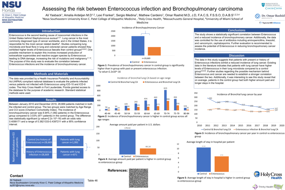 Enterococcus is the second leading cause of nosocomial infections in the United States behind Staphylococcus aureus. Lung cancer is the most commonly diagnosed type of cancer worldwide, and in the United States, it is responsible for the most cancer related deaths. Studies comparing lung microbiota and fecal flora in lung and colorectal cancer patients showed they exhibited higher levels of Enterococcus faecalis than control groups. One possible mechanism to explain this involves increased production of extracellular superoxides and reactive oxygen species by Enterococcus leading to DNA damage, increasing the risk of mutations and malignancy. The purpose of this study was to evaluate the correlation between Enterococcus infections and the incidence of bronchopulmonary cancer.
