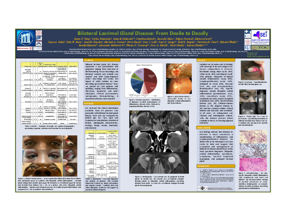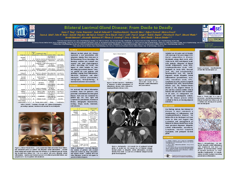 Purpose: Bilateral lacrimal gland (LG) disease represents a rare presentation with prognoses ranging from innocuous to life-threatening. To our knowledge, the literature contains only isolated case reports1 and brief single-diagnosis series2 describing this entity, the largest of which includes 14 cases describing IgG4-related disease.3 Here, we present 80 such patients with pathology ranging from inflammatory, infectious, neoplastic, and other etiologies. Clinical presentation, radiography, histopathology, & treatment outcomes were assessed.