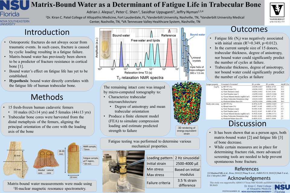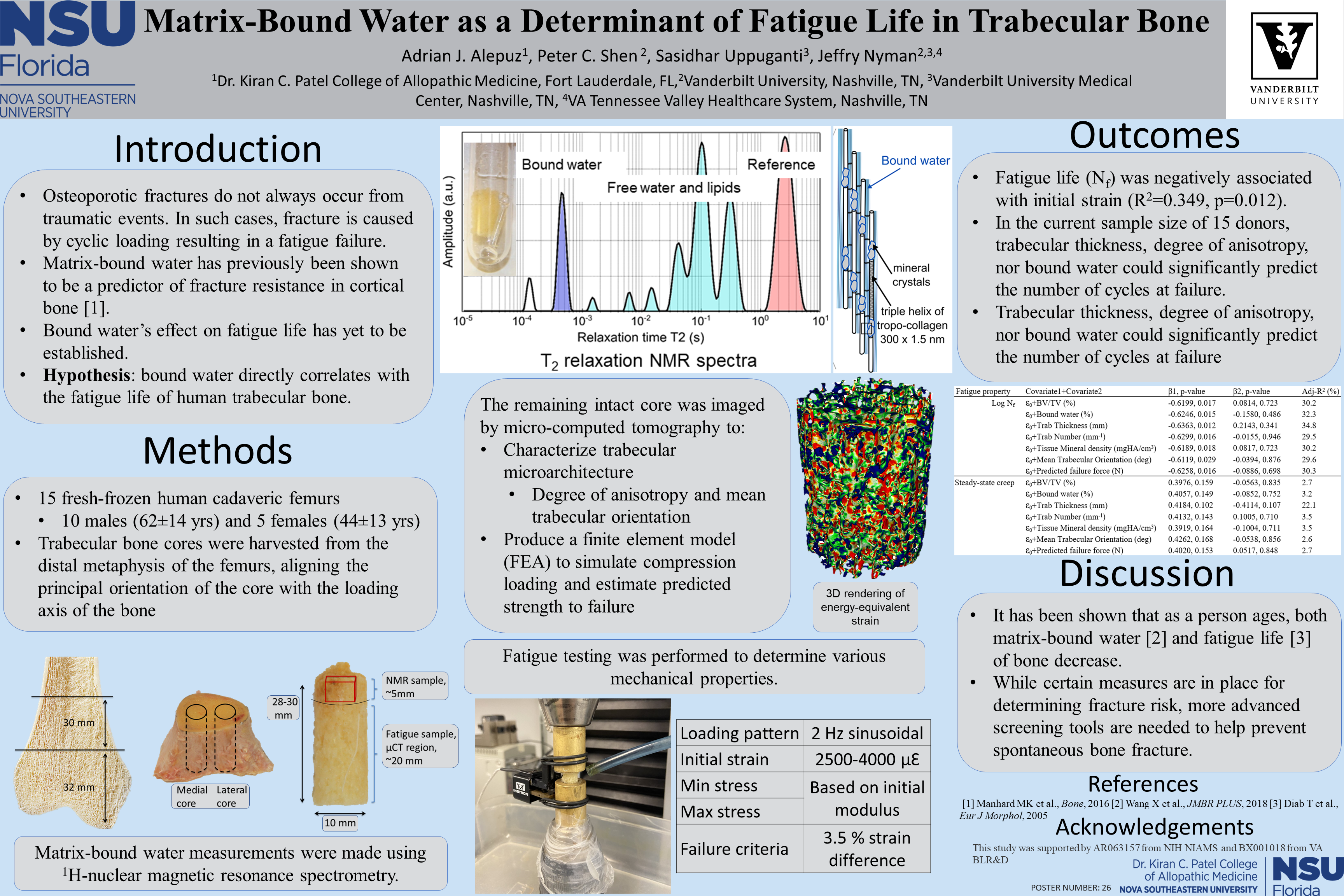 To test our hypothesis, we acquired fresh-frozen human cadaveric femurs from 16 donors. Trabecular bone cores were harvested from the distal metaphysis of the femurs, ensuring that the principal orientation of the core aligned with the loading axis of the bone. From each core, a mechanical testing specimen and an NMR sample were prepared for analysis. Cores were evaluated using microCT before undergoing fatigue testing, achieving target initial strains and loads. Standard mechanical equations for fatigue testing of cylindrical samples were used to calculate various biomechanical properties.