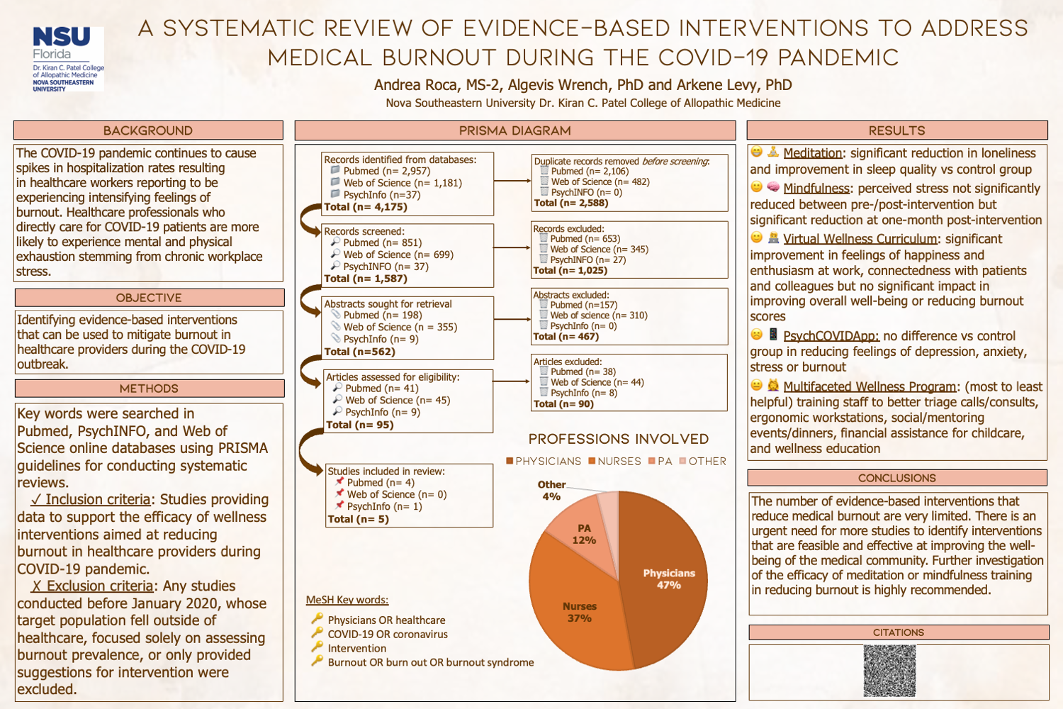 Methods: A PRISMA systematic review of articles from Pubmed, PsychINFO, and Web of Science databases was conducted using MeSH key words. Inclusion criteria was limited to studies providing data to support the efficacy of wellness interventions aimed at reducing burnout in healthcare providers during COVID-19 pandemic. Any studies conducted before January 2020, whose target population fell outside of healthcare, focused solely on assessing burnout prevalence, or only provided suggestions for intervention were excluded.