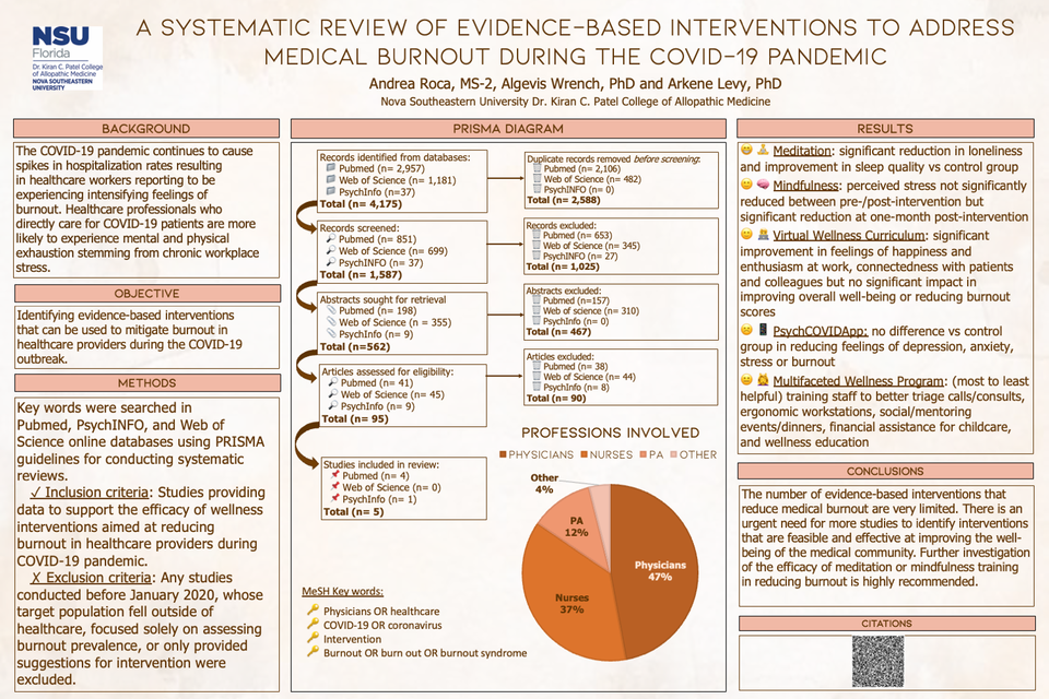 Conclusion: The number of evidence-based interventions are very limited. There is an urgent need to identify interventions that are effective and feasible for the well-being of the medical community. Further investigation of the efficacy of meditation or mindfulness training in reducing burnout is highly recommended.