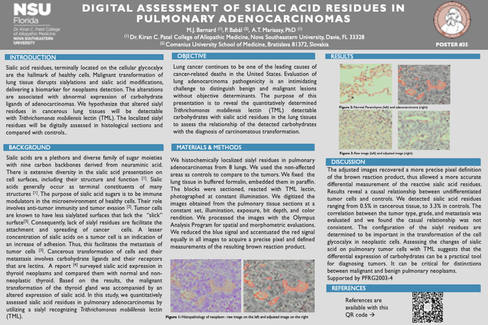 Introduction: Terminally located on the cellular glycocalyx, Sialic acid residues are the hallmark of healthy cells. Malignant transformation of lung tissue disrupts sialylations and sialic acid modifications, delivering a biomarker for neoplasms detection. The alterations are associated with abnormal expression of carbohydrate ligands of adenocarcinomas. We hypothesize that altered sialyl residues in cancerous lung tissues will be detectable with Trithrichomonas mobiliensis lectin (TML). The localized sialyl residues will be digitally assessed in histological sections.