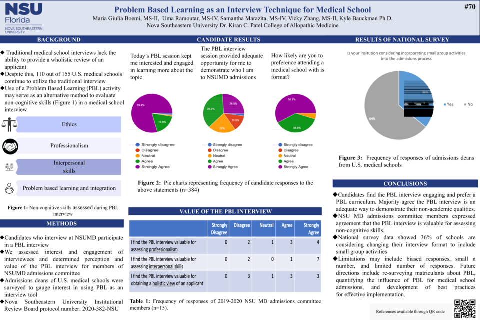 METHODS: Candidates who interview at NSUMD participate in a PBL interview. We assessed the interest and engagement of the interviewees and determined the perception and value of PBL interviews for members of NSUMD admissions committee. Admissions deans of U.S. medical schools were surveyed to gauge interest in PBL as an interviewing tool.