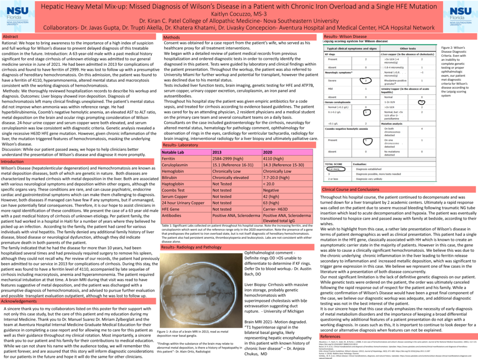 Rational: We hope to bring awareness to the importance of a high index of suspicion and full workup for Wilson’s disease to prevent delayed diagnosis of this treatable condition in the future. Introduction: A 63-year-old male with a past medical history significant for end stage cirrhosis of unknown etiology was admitted to our general medicine service in June of 2021. He had been admitted in 2013 for complications of cirrhosis and found to have ferritin of 2999. He was lost to follow up with a presumptive diagnosis of hereditary hemochromatosis. On this admission, the patient was found to have a ferritin of 4110, hyperammonemia, altered mental status and macrocytosis consistent with the working diagnosis of hemochromatosis.