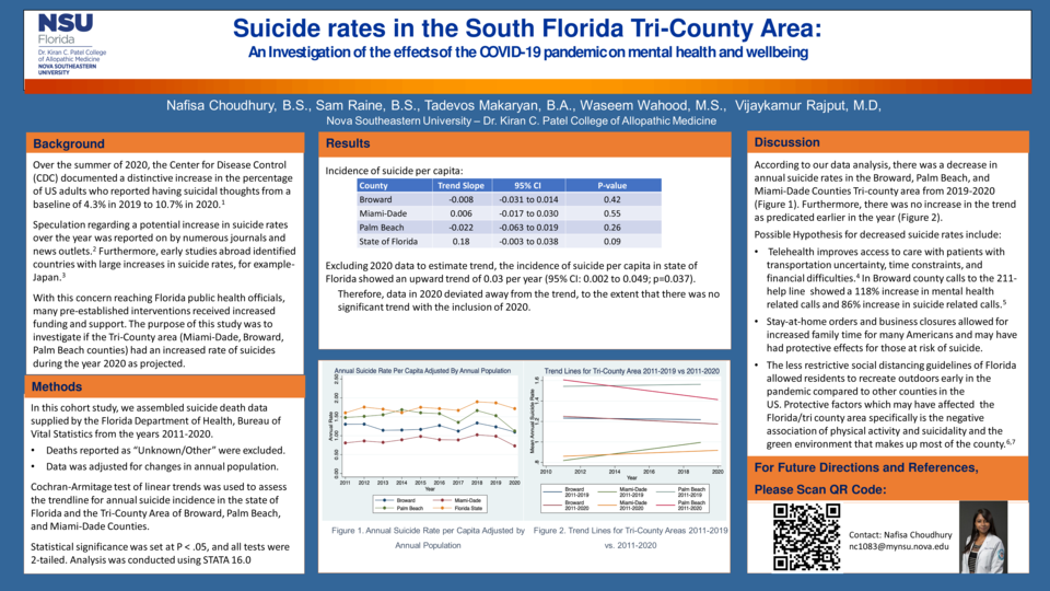The mental health effects of the pandemic, the economic recession, social distancing, and the stress of living through unprecedented times came with an associated increased incidence of major depressive disorder (MDD), generalized anxiety disorder, and substance use disorders. At the onset of the pandemic, these factors were speculated to come with detrimental effects on mental health and a subsequent potential increase in suicide rates. However, as the year 2020 ended, there was a paradoxical decrease in the suicide rates in Broward, Palm Beach, and Miami-Dade Counties. In this retrospective cohort study, the suicide death data were collected from the Florida Department of Health, Bureau of Vital Statistics from the years 2010 through 2020. The Cochran-Armitage test of linear trends were used to evaluate any significant changes in suicide trends. The incidence of suicide remained stable in all three south Florida counties. Furthermore, after excluding 2020 data, the incidence of suicide per capita in state of Florida showed an upward trend of 0.03 per year till 2019 (95% CI: 0.002 to 0.049; p=0.037). The decrease in suicide rates in the tri-county area during the pandemic year of 2020 may be attributed to increased utilization of telehealth, increased time spent with family during lockdown, and less restrictive social distancing guidelines in the state of Florida allowing for the ability to exercise and use green spaces. The impacts of COVID-19 on suicide and mental health must be analyzed further to determine methods to mitigate risk, alleviate suicide risk factors, and enhance protective factors.