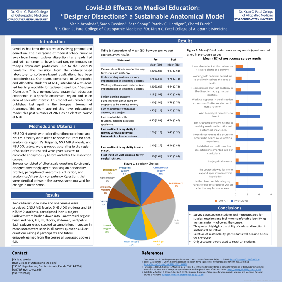 Covid-19 has been the catalyst of evolving personalized education. The divergence of medical school curricula away from human cadaver dissection has already had and will continue to have broad-ranging impacts on today’s physicians’ proficiency. Due to the Covid-19 pandemic, the transition from the cadaver-based laboratory to software-based applications has been expedited1,2,3,4. Our team, composed of Osteopathic and Allopathic students at NSU, introduced a student- led teaching modality for cadaver dissection. “Designer Dissections,” is a personalized, anatomical education experience in a specific anatomical region and in an area of specialty interest. This model was created and published last April in the European Journal of Anatomy4. This team applied this novel educational model this past summer of 2021 as an elective course at NSU.