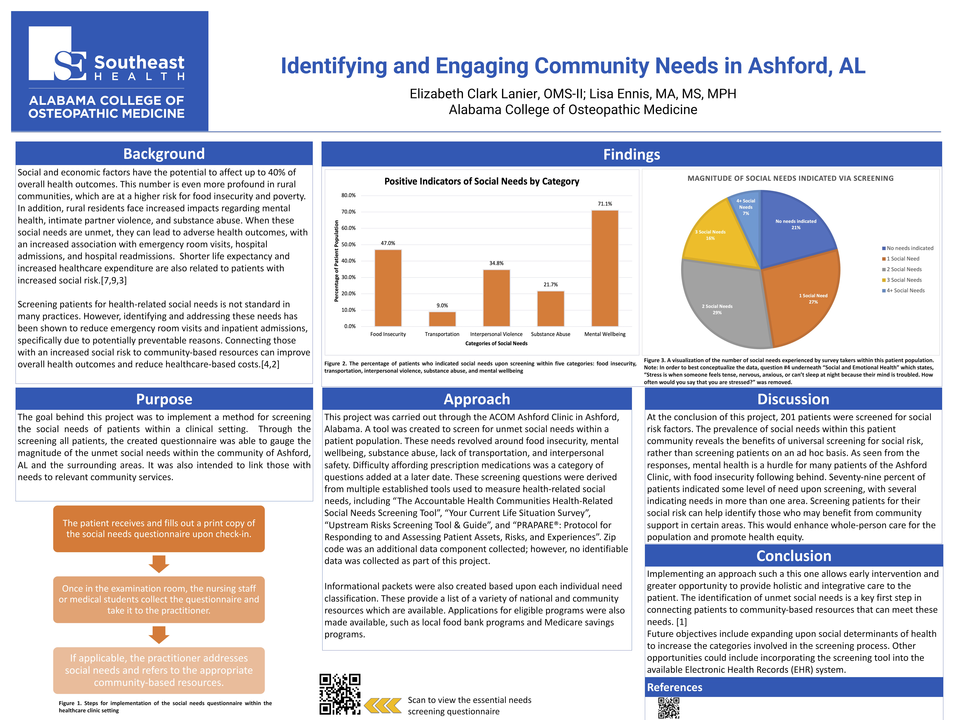 The purpose of this project was to engage with vulnerable members of the Wiregrass community through implementing a method for screening and engaging the social needs of patients in a clinic setting.