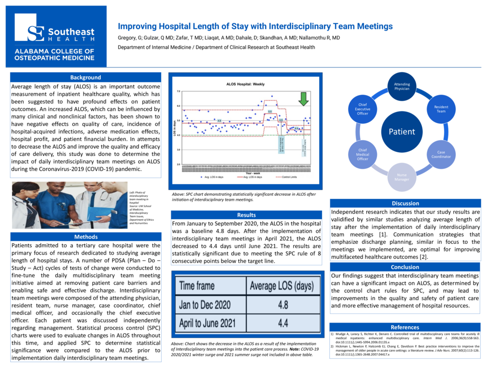 Average length of stay (ALOS) is an important outcome measure of inpatient healthcare quality, which has been suggested to have profound effects on patient outcomes. An increased ALOS, which can be influenced by many clinical and nonclinical factors, has been shown to have negative effects on quality of care, incidence of hospital-acquired infections, adverse medication effects, hospital profit, and patient financial burden. In attempts to decrease the ALOS and improve the quality and efficacy of care delivery, this study was done to determine the impact of daily interdisciplinary team meetings on ALOS during the Coronavirus-2019 (COVID-19) pandemic. The study focus was on patients admitted to a tertiary care community hospital during the time period of January 2020 to September 2021. Statistical process control (SPC) charts were used to evaluate changes in ALOS throughout this time, and end-outcomes of ALOS were compared to the ALOS prior to implementation of daily interdisciplinary team meetings. From January to December 2020, the ALOS in the hospital was 4.8 days. After the integration of daily interdisciplinary team meetings in April 2021, the ALOS showed an initial decrease to 4.4 days. This finding suggests that interdisciplinary team meetings can have a statistically significant impact on ALOS, as determined by the control chart rules for SPC, and may lead to improvements in the quality and safety of patient care and more effective management of hospital resources.