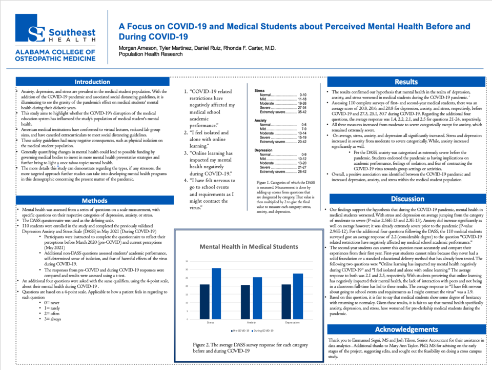 110 students were enrolled in the study and completed the previously validated Depression Anxiety and Stress Scale (DASS) in May 2021. Participants were instructed to complete the questionnaire to reflect their perceptions before March 2020 (pre-COVID) and current perceptions. Additional non-DASS questions assessed students' academic performance, self-determined sense of isolation, and fear of harmful effects of the virus during COVID-19. May 2021 and pre-COVID responses were compared and results were assessed using a t-test.