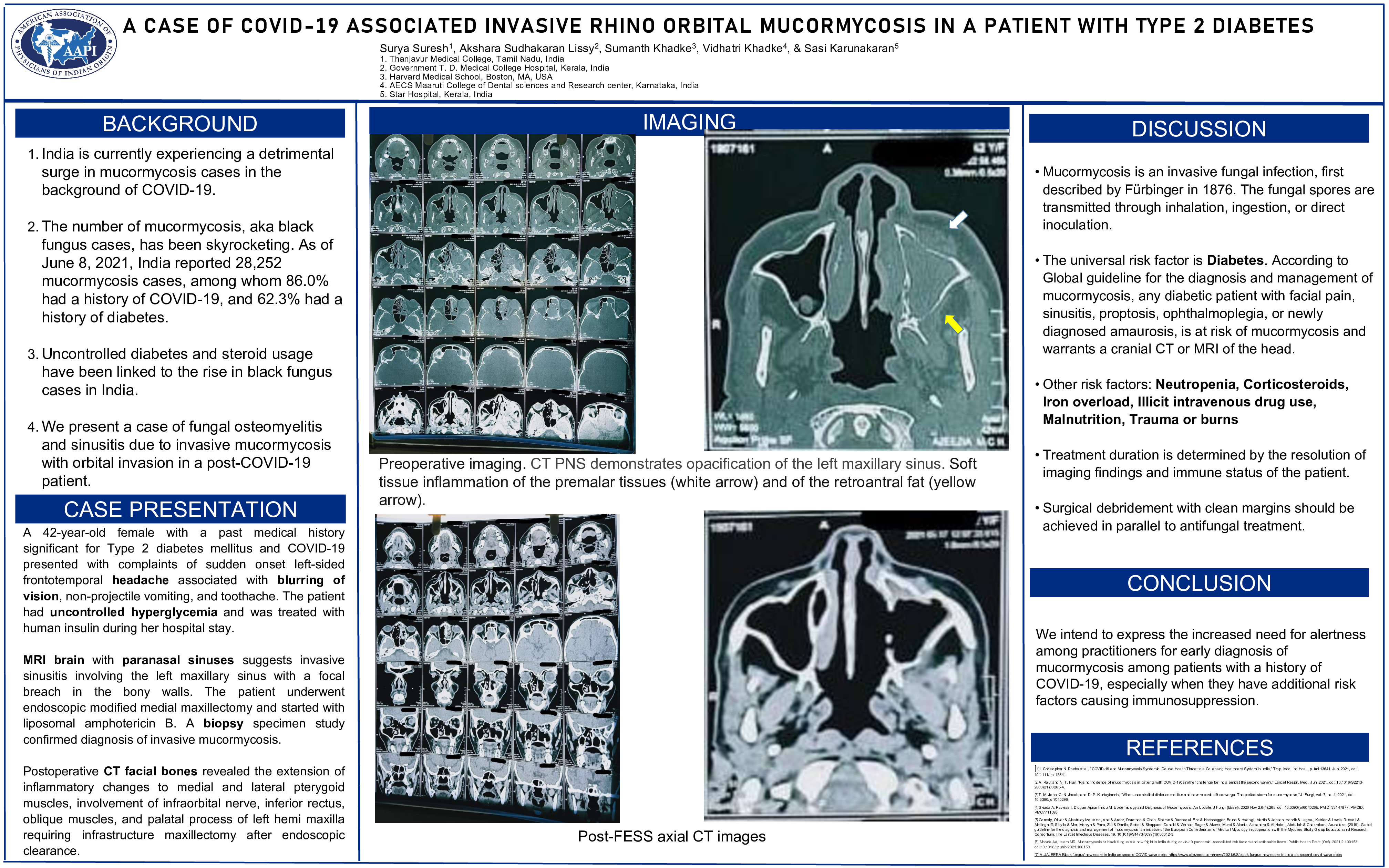 We intend to express the increased need for alertness among practitioners for early diagnosis of mucormycosis among patients with a history of COVID-19, especially when they have additional risk factors causing immunosuppression.
