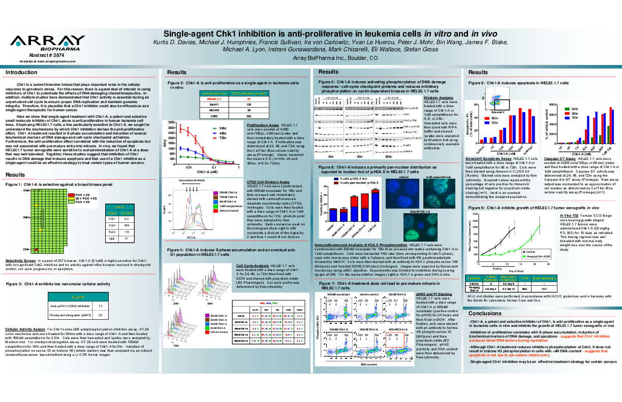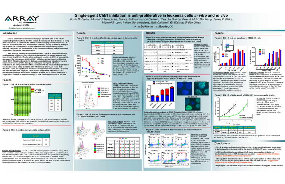 Chk1 is a serine/threonine kinase that plays important roles in the cellular response to genotoxic stress. For this reason, there is a great deal of interest in using inhibitors of Chk1 to potentiate the effects of DNA-damaging chemotherapeutics. In addition, multiple studies have demonstrated that Chk1 activity is essential during an unperturbed cell cycle to ensure proper DNA replication and maintain genomic integrity. Therefore, it is plausible that a Chk1 inhibitor could also be efficacious as a single-agent therapeutic for human cancer. Here we show that single-agent treatment with Chk1-A, a potent and selective small molecule inhibitor of Chk1, alone is anti-proliferative in human leukemia cell lines. Employing HEL92.1.7 cells, a line particularly sensitive to Chk1-A, we sought to understand the mechanisms by which Chk1 inhibition derives the anti-proliferative effect. Chk1-A treatment resulted in S-phase accumulation and induction of several biochemical markers of DNA damage and cell-cycle checkpoint activation. Furthermore, the anti-proliferative effect correlated with the induction of apoptosis but was not associated with pre-mature entry into mitosis. In vivo, we found that HEL92.1.7 tumor xenografts were sensitive to oral administration of Chk1-A at a dose that was well tolerated. Together, these studies suggest that inhibition of Chk1 results in DNA damage that induces apoptosis and that use of a Chk1 inhibitor as a single-agent could be an effective strategy to treat certain types of human cancers.