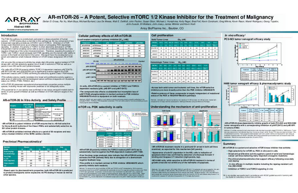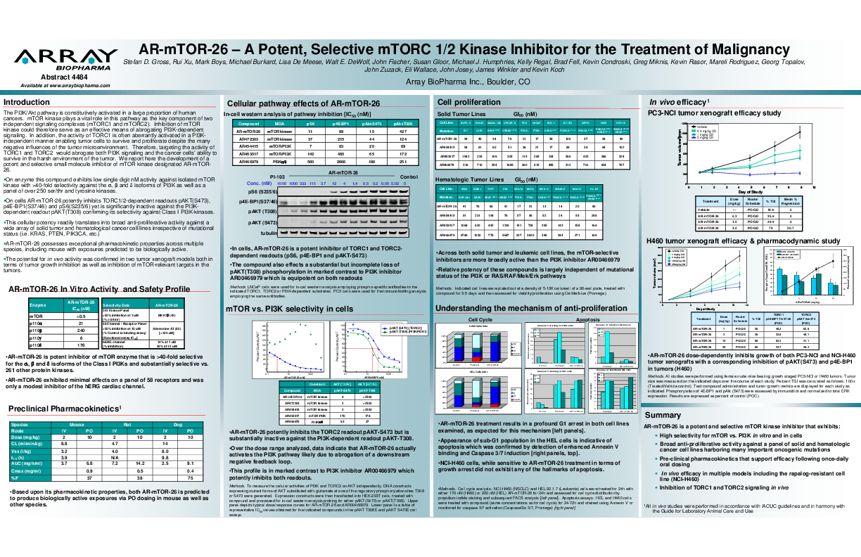 The PI3K/Akt pathway is constitutively activated in a large proportion of human cancers. mTOR kinase plays a vital role in this pathway as the key component of two independent signaling complexes (mTORC1 and mTORC2). Inhibition of mTORkinase could therefore serve as an effective means of abrogating PI3K-dependent signaling. In addition, the activity of TORC1 is often aberrantly activated in a PI3Kindependent manner enabling tumor cells to survive and proliferate despite the many negative influences of the tumor microenvironment. Therefore, targeting the activity of TORC1 and TORC2 would abrogate both PI3K signaling and the cancer cells’ ability to survive in the harsh environment of the tumor. We report here the development of a potent and selective small molecule inhibitor of mTOR kinase designated AR-mTOR-26.On enzyme this compound exhibits low single digit nM activity against isolated mTORkinase with >40-fold selectivity against the α, β and δ isoforms of PI3K as well as a panel of over 250 ser/thr and tyrosine kinases.On cells AR-mTOR-26 potently inhibits TORC1/2-dependent readouts pAKT(S473), p4E-BP1(S37/46) and pS6(S235/6) yet is significantly inactive against the PI3Kdependent readout pAKT(T308) confirming its selectivity against Class I PI3K-kinases.This cellular potency readily translates into broad anti-proliferative activity against a wide array of solid tumor and hematological cancer cell lines irrespective of mutational status (i.e. KRAS, PTEN, PIK3CA, etc.) AR-mTOR-26 possesses exceptional pharmacokinetic properties across multiple species, including mouse with exposures predicted to be biologically active.The potential for in vivo activity was confirmed in two tumor xenograft models both in terms of tumor growth inhibition as well as inhibition of mTOR-relevant targets in the tumors.