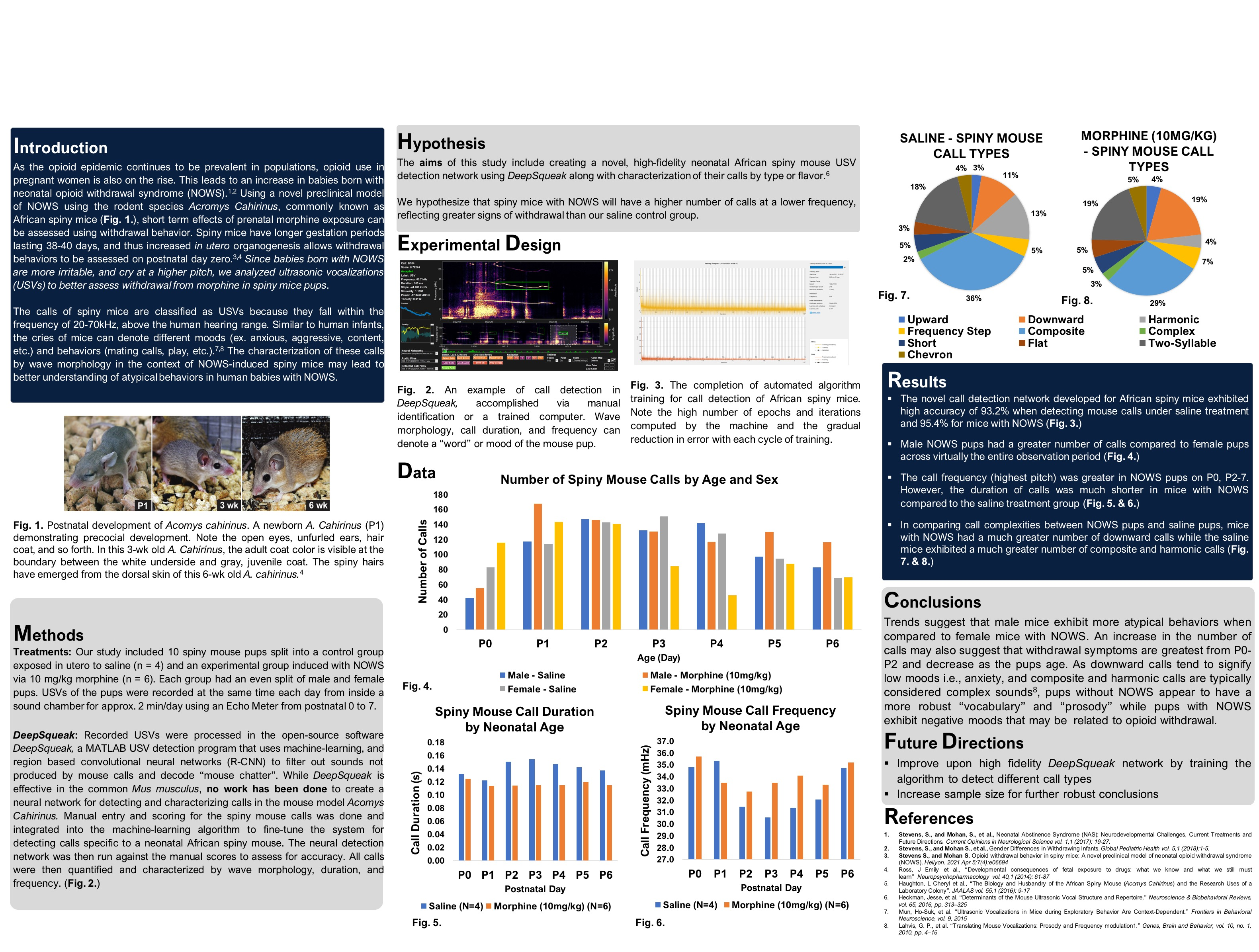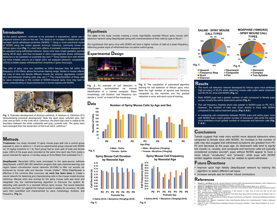 NOWS was induced in spiny mouse pups by injecting dams with morphine (10 mg/kg) and recording the pup’s ultrasonic vocalization (USV’s) from postnatal 0 to 7. USVs were recorded using an Echo Meter used to detect bats since mice also have call frequency from 20-70 kHz, above the human hearing range. Recorded USVs were processed in open-source software called DeepSqueak; a MATLAB USV detection program designed by the Coffey lab at the University of Washington, School of Medicine. DeepSqueak uses machine-learning and region-based convolutional neural networks (R-CNN) to filter out sounds that are not produced by mouse calls and decode “mouse chatter” between different mice. While DeepSqueak is effective in the common Mus musculus, no work has been done in detecting and characterizing mouse calls in African spiny mice. The aims of this study include creating a novel, high-fidelity neonatal African spiny mouse USV detection network using DeepSqueak along with the characterization of their calls according to type or flavor. We hypothesize that spiny mice with NOWS will have a higher number of calls, exhibiting greater signs of withdrawal as reflected by the number of low-frequency calls.