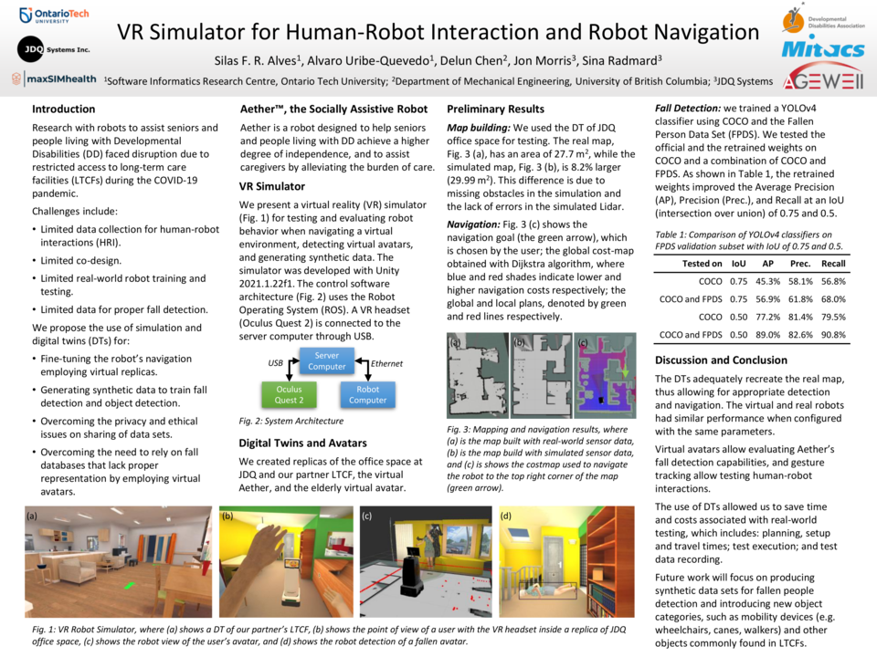 Research with robots to assist seniors and people living with Developmental Disabilities (DD) faced disruption due to restricted access to long-term care facilities (LTCFs) during the COVID-19 pandemic. It hindered data collection for human-robot interactions (HRI) and fall detection. An alternative is the use of simulation for (i) fine-tuning the robot’s navigation, and (ii) generating synthetic data to overcome the challenges of collecting data and the privacy and ethical issues on sharing of data sets. Herein, we present a virtual reality (VR) simulator for testing and evaluating robot behaviour when navigating a virtual environment, detecting virtual avatars, and generating synthetic data.