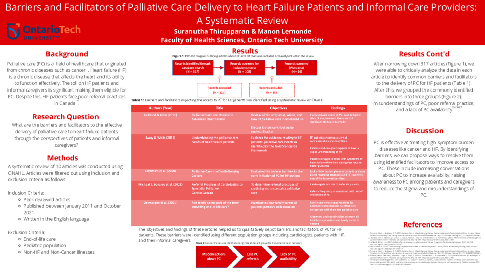 Introduction: Palliative care (PC) is a growing field of healthcare that originated from chronic diseases such as cancer (Crimmins, Elliott, & Absher, 2021). Among chronic diseases, heart failure (HF) is a chronic disease that affects the heart and its ability to function effectively. The toll on HF patients and informal caregivers is significant making them eligible for PC. This research will explore the question: What are the barriers and facilitators to the effective delivery of palliative care to heart failure patients, through the perspectives of patients and informal caregivers?
