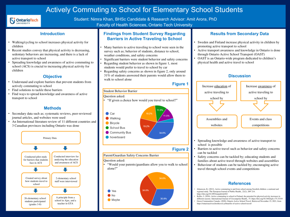 Methods: A literature review was done using secondary sources, for instance, systematic reviews, peer-reviewed journals, and grey literature such as websites, and manuals. Further, primary research was conducted; a pilot study for barriers students face in ACS. The pilot study was a survey that 26 elementary school students (grades 3-8) participated in. The survey contained questions about how students travel to school. Moreover, to analyze the education and awareness of ACS in Ontario, 2 elementary school staff were interviewed; a principal of a school in Ajax and a teacher in the GTA.