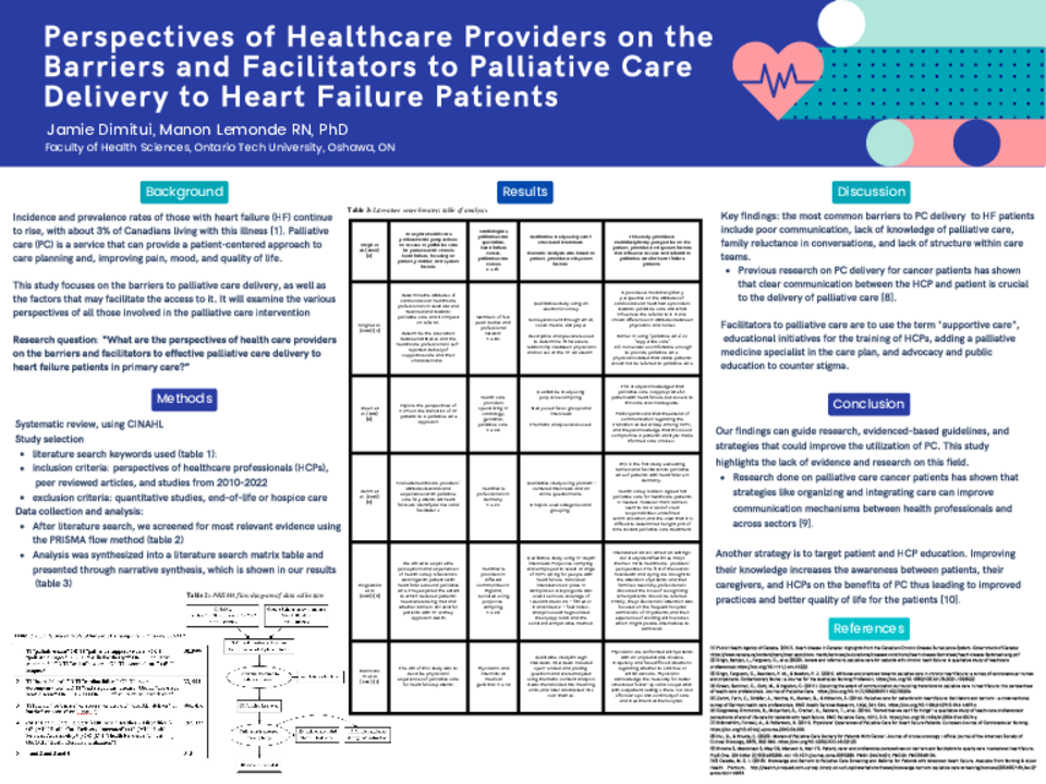 Results: Our findings indicate the existence of barriers in communication, patient discussions, education, and referral. In addition, coordination and cooperation in decision-making is lacking among different care teams. Research shows that healthcare providers lack knowledge of palliative care delivery for HF patients, and this may be directly linked to inadequate referral for PC services. Facilitators to palliative care are using the term "supportive care", implementing educational initiatives for the training of HCPS, adding a palliative medicine specialist in the care plan, and advocating for public education to counter stigma.