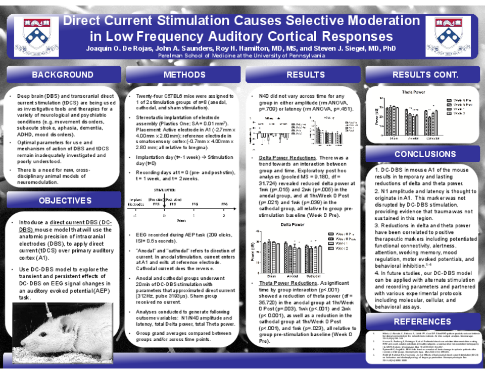 Methods: Twenty-four mice were assigned to one of two stimulation groups or a sham group and were implanted with electrodes in A1. Stimulation groups underwent DC-DBS stimulation for 20min at 20 ยตA. Auditory EEG was recorded before stimulation and at 1hr, 1wk, and 2wk post-stimulation. EEG was analyzed for changes in N1 (N100 in humans, N40 in mice) amplitude and latency as well as delta and theta power.