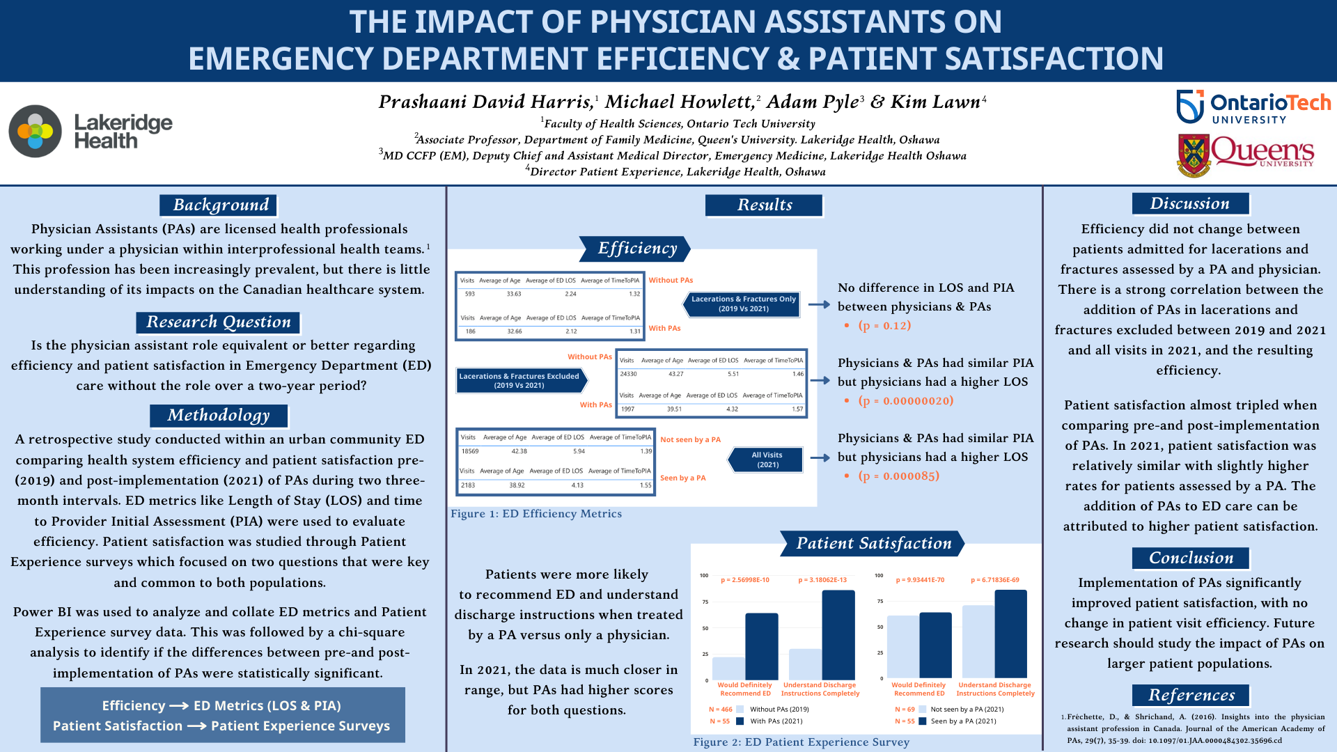 Methodology: A retrospective study was conducted in an urban community Emergency Department (ED) comparing patient satisfaction and efficiency in two three-month intervals in 2019 and 2021, between pre-and post-implementation of PAs. Patient satisfaction was studied through surveys focusing on two questions, “Would you recommend this ED?” and “Did you understand discharge instructions?” Length of Stay (LOS) and Provider Initial Time (PIA) were collected in patients with lacerations and fractures seen by physicians (2019) and PAs (2021) to compare ED efficiency.