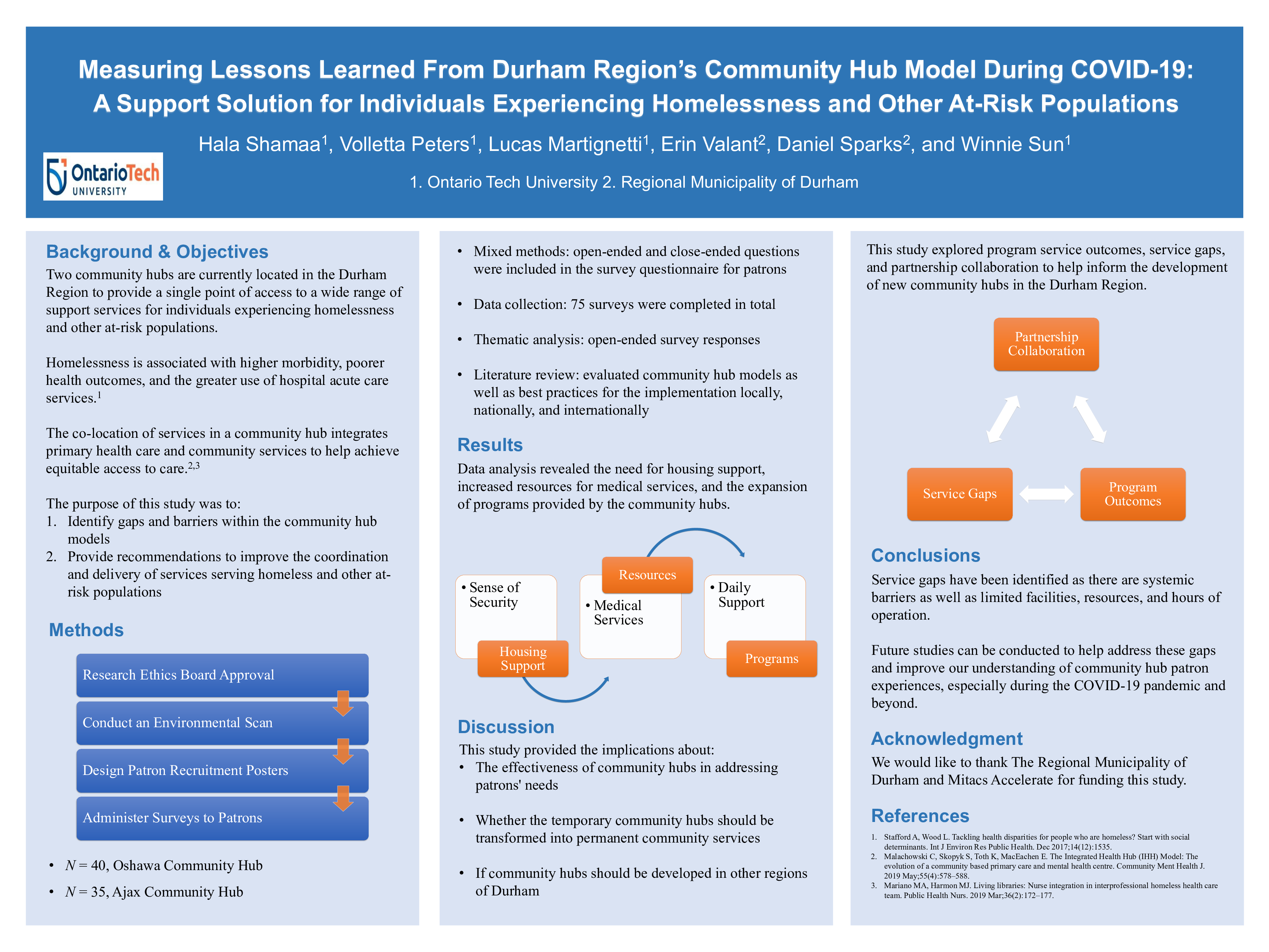 Background: Two community hubs are currently located in the Durham Region to provide a single point of access to a wide range of support services for individuals experiencing homelessness and other at-risk populations. The community hub in Oshawa is formally known as the Back Door Mission for the Relief of Poverty and the community hub in Ajax is formally known as the Ajax Hygiene Hub. It is unclear if these two community hubs are effective in addressing the needs of patrons and how the COVID-19 pandemic continues to impact these services amongst this population. This study was conducted to identify gaps and barriers within the community hub models as well as provide recommendations to improve the coordination and delivery of services serving homeless and other at-risk populations.