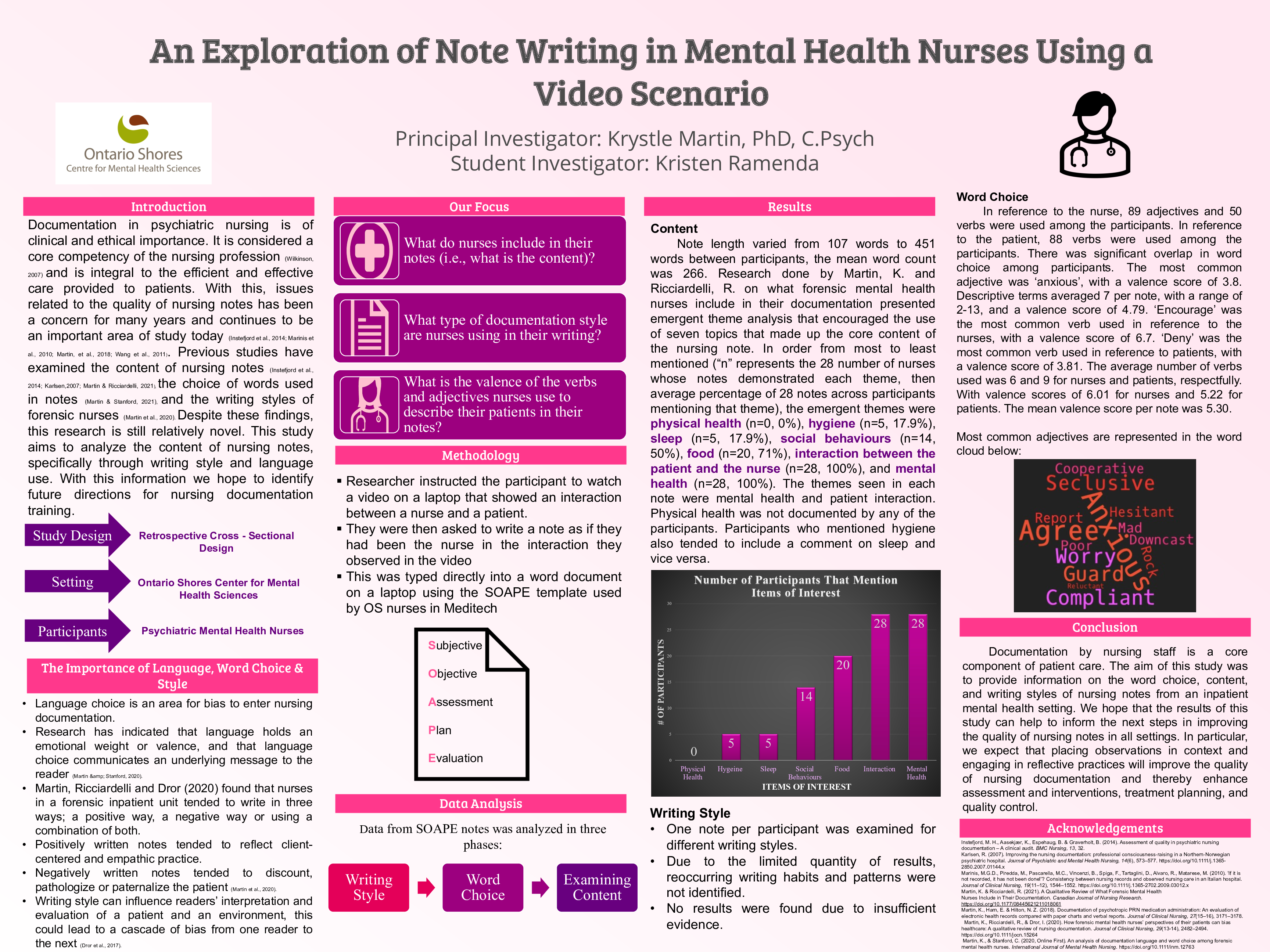 Good quality documentation is an essential component of nursing practice and is vital to the efficient and effective are provided to patients. Improper language, word choice and style in a nursing note can mislead the reader and leave room for bias and misunderstanding of the patient. The objective of this study was to explore the quality of nursing notes by examining word choice and content of documentation from an inpatient mental health setting. Twenty-six nurses were presented with video of a patient-nurse interaction and asked to document the interaction as if they were the nurse in the scenario. Completed notes were analyzed and dissected to examine word choice, content, and writing style. Results indicated that most participants commented on mental health signs and symptoms but did not document on hygiene and sleep. Every note mentioned the interaction between the patient and nurse, and mental health. Examination of valence scores of the adjectives and verbs in the notes indicates that most nurses describe their patients in a rather neutral manner. Taken together, there is an opportunity for improvement in the language and content of nursing documentation to elevate the accuracy and usefulness of nursing documentation and thereby support the proper care of patients in an inpatient mental health setting.