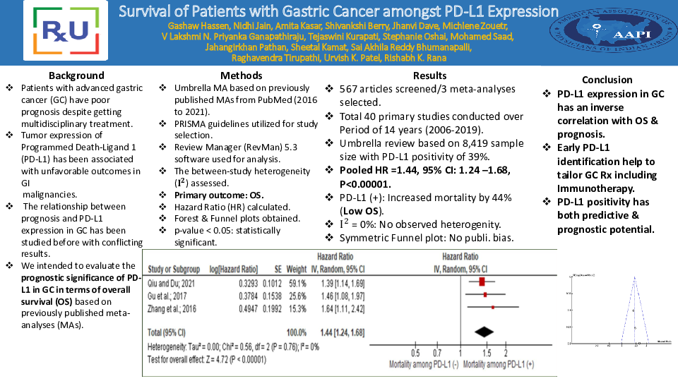 Of the total of 567 articles screened; 14 studies were assessed for eligibility. Out of which, three meta-analyses were included for umbrella review with a total of 8,419 sample size having PD-L1 positivity of 39%. A total of 40 primary studies conducted over a period of 14 years (2006-2019) were included in the 3 meta-analyses. All the 3 studies included in the umbrella review showed that PD-L1 positive expression was associated with low OS in GC with increased mortality (HR =1.44, 95% CI: 1.24 –1.68, P< 0.00001). Interstudy variability (I2) was 0%. (Figure)
