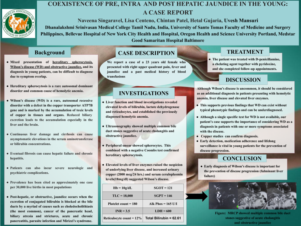 Introduction: Hereditary spherocytosis is an autosomal dominant disorder rendering red blood cells incapable of maintaining a biconcave shape. Wilson’s disease (WD) is a rare, autosomal recessive disorder causing a defect in the copper transporter ATP7B gene, and is marked by toxic levels of copper especially in the liver and brain. Resultant liver cirrhosis and fibrosis can cause asymptomatic elevations in serum aminotransferase or bilirubin, as well as hepatic failure, chronic hepatitis, and severe neurologic and psychiatric complications. Approximately one case in 30,000 live births has been cited in most populations . Post-hepatic, or obstructive, jaundice is due to the blocked excretion of conjugated bilirubin at the bile ducts, and causes include choledocholithiasis, cancer of the pancreatic head, biliary atresia, and acute and chronic pancreatitis .