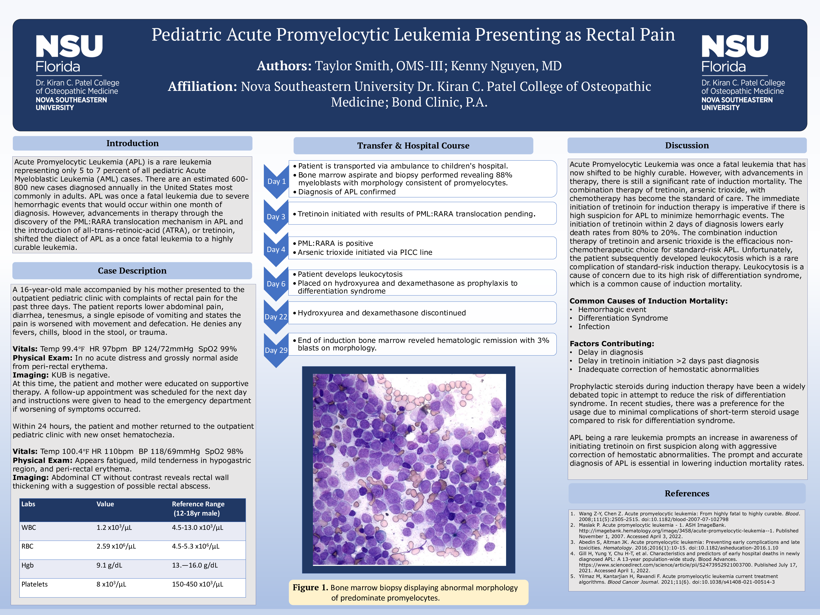 Case Description: A 16-year-old male accompanied by his mother presented to the outpatient pediatric clinic with complaints of rectal pain for the past three days. The patient reports lower abdominal pain, diarrhea, tenesmus, a single episode of vomiting and states the pain is worsened with movement and defecation. He denies any fevers, chills, blood in the stool, or trauma. On presentation, vital signs were found to be stable and physical exam findings were grossly normal aside from peri-rectal erythema. A KUB was ordered with results being negative, at this time the patient and mother were educated on supportive therapy. A follow-up appointment was scheduled for the next day and instructions were given to head to the emergency department if worsening of symptoms occurred. Within the next 24 hours, the patient and mother returned to the outpatient pediatric clinic with new onset hematochezia. The patient now presented as febrile, tachycardic, and displayed mild tenderness in the hypogastric region with continued peri-rectal erythema. At this point, an abdominal CT without contrast was ordered along with a complete blood count, complete metabolic panel, and urinalysis. The CT findings revealed rectal wall thickening with the suggestion of a rectal abscess and the lab work showed pancytopenia with severe thrombocytopenia as a platelet count of 8,000 per microliters of blood. The patient was then transported via ambulance to the nearest children’s hospital. At the children’s hospital, a bone marrow aspirate and biopsy were performed which revealed 88 percent myeloblasts with a morphologic evaluation consistent of promyelocytes. The biopsy confirmed the diagnosis of APL and within two days the patient was started on tretinoin while awaiting results for the PML:RARA translocation. With the translocation present, the initiation of arsenic trioxide was implemented via PICC line. Subsequently, the patient developed leukocytosis and was placed on hydroxyurea and dexamethasone due to the risk for differentiation syndrome. On day 29, end of induction bone marrow aspirate and biopsy was consistent with hematologic remission with 3% blasts on morphology.