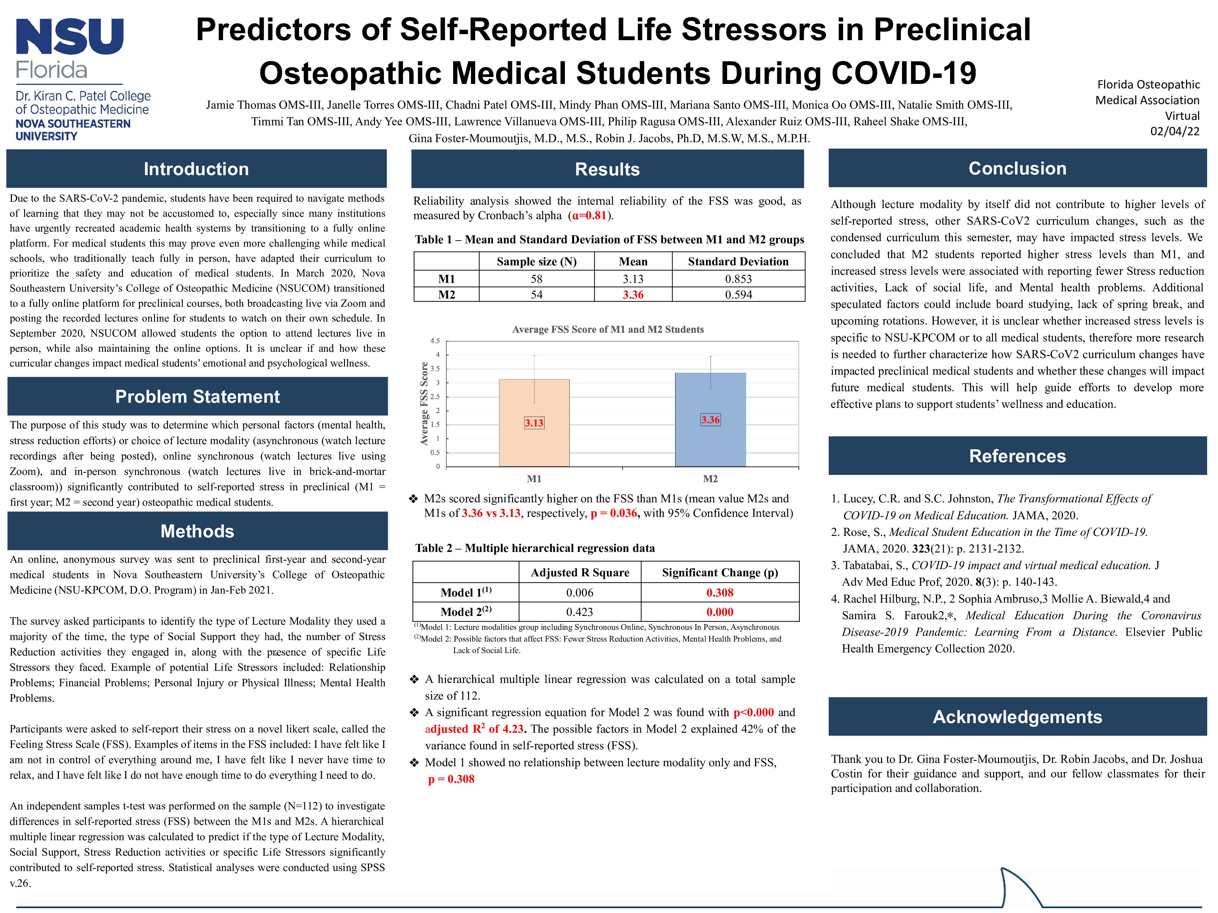 Methods: An online, anonymous survey was sent to first and second-year medical students in Nova Southeastern University’s College of Osteopathic Medicine in Jan-Feb 2021. Participants were asked to identify the lecture modality they used the most, type of social support, number of stress reduction activities they engaged in, and the presence of life stressors. They self-reported their stress on a novel Likert scale, called the Feeling Stress Scale (FSS). An independent samples t-test was performed on the sample (N=112) to investigate differences in self-reported stress between M1s and M2s. A hierarchical multiple linear regression was calculated to see if the lecture modality, social support, stress reduction activities, or specific life stressors significantly contributed to self-reported stress. Statistical analyses were conducted using SPSS v.26.