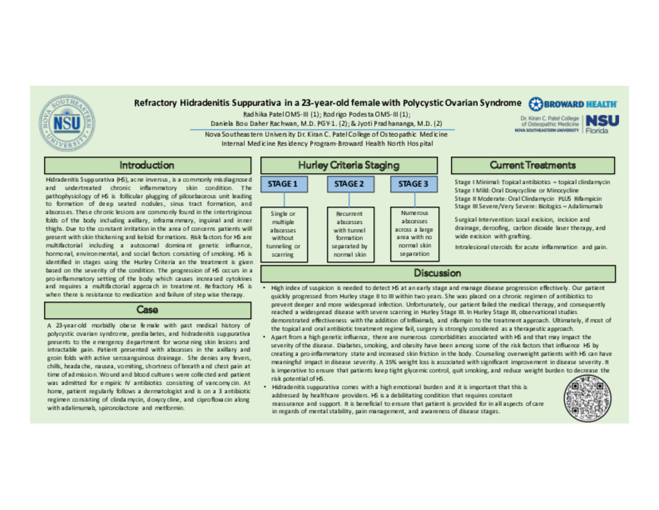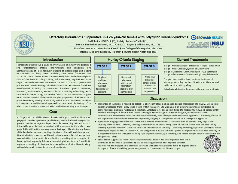 Case Description: We discuss the case of a 23-year-old African American female patient that presented to us for intractable pain and abscess formation in the axilla and groin area. Past medical history consists of polycystic ovarian syndrome, prediabetes, and morbid obesity. Patient was diagnosed with HS two years ago, currently at Hurley stage 3, on a 3 antibiotic regimen that includes oral clindamycin, ciprofloxacin, and doxycycline, along with a monoclonal antibody, adalimumab with no significant improvement. PCOS and prediabetes are managed with spironolactone and metformin. Family history includes diabetes mellitus and extensive history of HS on her maternal side. She is a non-smoker, and consumes alcohol socially. Upon admission, wound cultures and blood cultures were obtained to further analyze for an infectious process. She was started on empiric IV vancomycin. On skin examination, patient had thickened lesions representing scarring tissue and keloids, associated with active serosanguinous drainage in multiple sites of the axilla and groin. Patient stayed in the hospital for 4 days, received IV antibiotics which were discontinued after blood and wound cultures came back negative. Plastic surgery recommended local excision and skin grafting with hyperbaric O2 therapy. Upon discharge she was restarted on her 3 antibiotic regimen and adalimumab. She was referred to pain management and plastic surgery for outpatient follow up.
