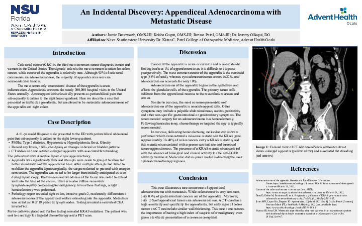 Case description: A 61-year-old Hispanic male with a past medical history of diabetes, hypertension, hyperlipidemia, gout and obesity presented to the emergency room with worsening abdominal pain over two days. He initially had periumbilical pain that later intensified and localized to the right lower quadrant. computed tomography (CT) abdomen showed signs of appendicitis including an engorged, fluid filled appendix with wall thickening and associated fat stranding. The patient denied any fevers, chills, headache, chest pain, changes in bowel or bladder habits, or numbness or tingling in extremities. The patient went for a routine laparoscopic appendectomy. During the procedure, the appendix was noted to be significantly firm and attempts were made to grasp it to allow for better visualization of the appendiceal base. After multiple attempts had failed to mobilize the appendix laparoscopically, the surgeon elected to proceed with an open conversion. The appendix was noted to be larger than initially anticipated as seen during laparoscopy. The firmness and woodiness of the tissue was noted to extend well into the base of the cecum. There was also diffuse mesenteric lymphadenopathy concerning for malignancy. Given these findings, a right hemicolectomy was performed. The pathology report revealed moderately differentiated metastatic adenocarcinoma. Oncology was brought on board and the carcinoembryonic antigen (CEA) was determined to be 6.8. Patient was discharged with plans for PET scan and portacath for chemotherapy.