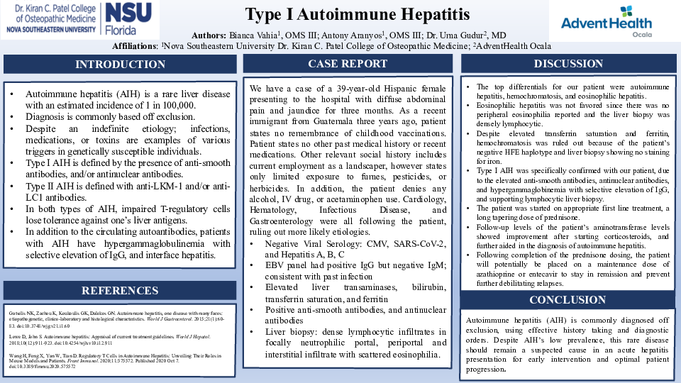Discussion: Autoimmune hepatitis (AIH) is commonly diagnosed off exclusion, using effective history taking and diagnostic orders. The top differentials for our patient were autoimmune hepatitis, hemochromatosis, and eosinophilic hepatitis. Eosinophilic hepatitis was not favored with no peripheral eosinophilia reported and a densely lymphocytic liver biopsy. Hemochromatosis was ruled out despite elevated transferrin saturation and ferritin because of the patient’s negative HFE haplotype and liver biopsy showing no staining for iron. Type I AIH was specifically confirmed with our patient, due to the elevated anti-smooth antibodies, antinuclear antibodies, and hypergammaglobinemia with selective elevation of IgG, and supporting lymphocytic liver biopsy. Despite AIH’s low prevalence, this rare disease should remain a suspected cause in an acute hepatitis presentation for early intervention and optimal patient progression.