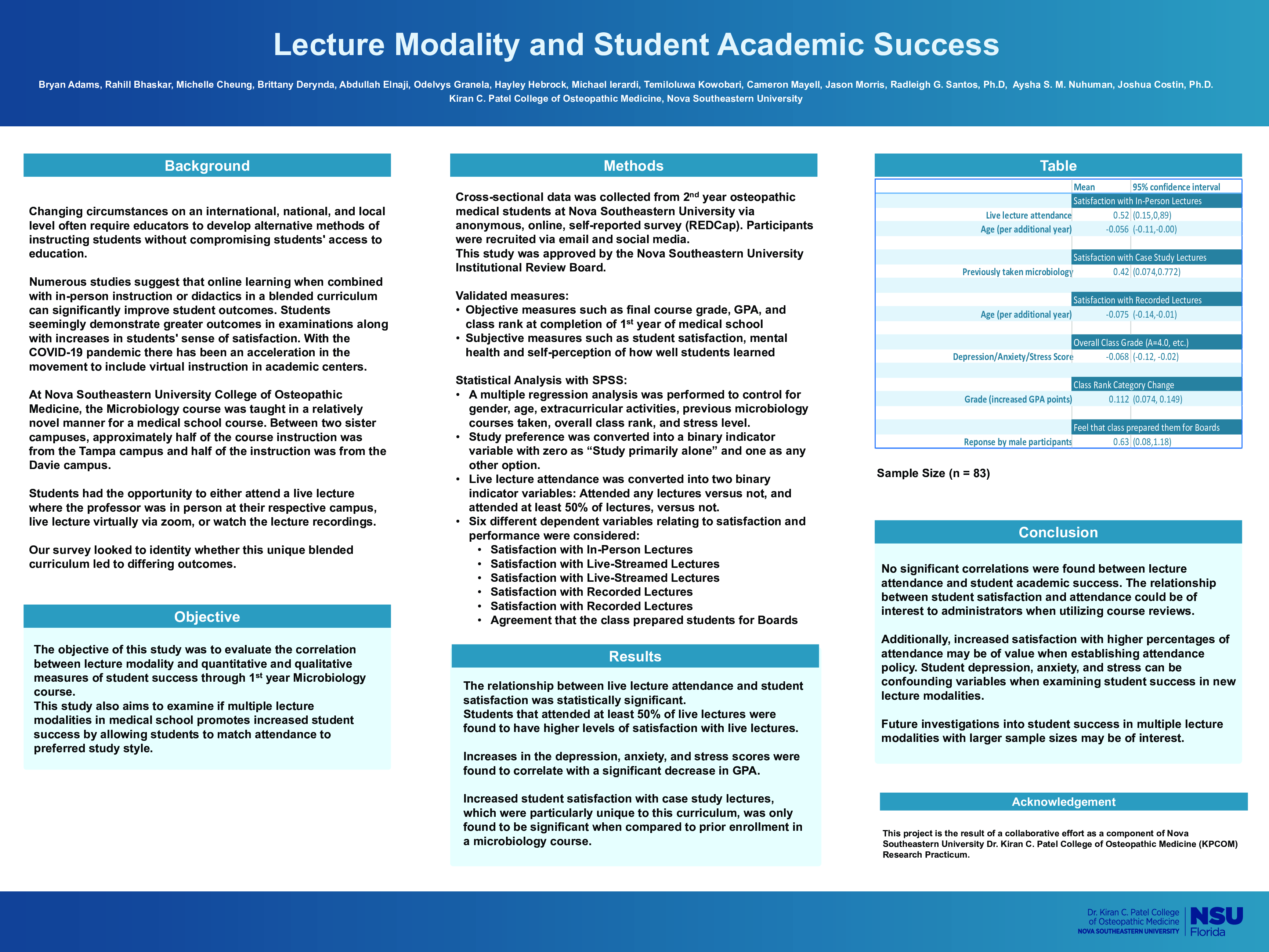Methods: An anonymous online survey was created through RedCap and distributed to second year medical students at Nova Southeastern University Dr. Kiran C Patel College of Osteopathic Medicine via email (N=83). The survey included a demographic section, questions relating to mental health at the time of course, questions pertaining to percent of live lectures attended, and student satisfaction for each lecture modality. Student academic success was measured with final course grade and GPA at completion of first year of medical school with class rank.