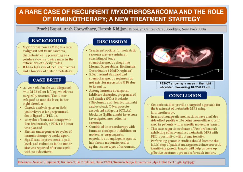 Myxofibrosarcoma (MFS) is a rare malignant soft-tissue sarcoma characteristically presenting as a painless slowly growing mass in the extremities of elderly males. It is a malignant tumour with a high risk of local recurrence and a low risk of distant metastasis. It tends to become a progressively higher grade in recurrences. Local occurrences of MFS are treated surgically but metastatic presentations do not have effective treatment modalities. The recent development in genomic studies has provided us with an advanced treatment modality in the form of immunotherapy. Programmed Death Ligand 1 (PDL1) is a therapeutic target found in sarcomas. Pembrolizumab, a monoclonal antibody targeting PDL1, is highly effective against tumours with this marker.
