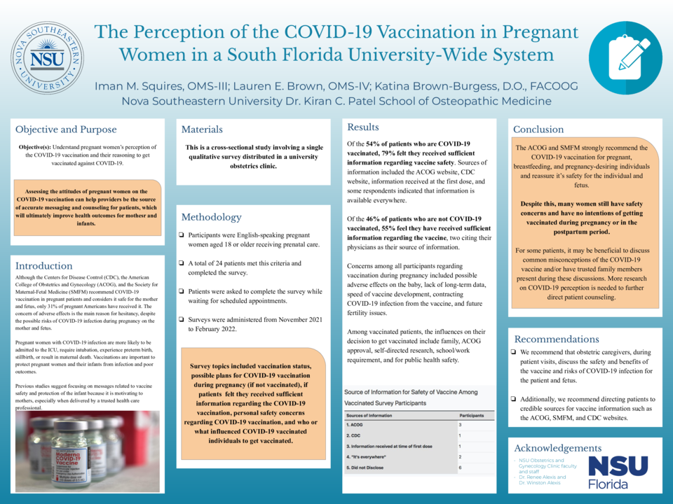 Although the Centers for Disease Control (CDC), the American College of Obstetrics and Gynecology (ACOG), and the Society for Maternal-Fetal Medicine recommends COVID-19 vaccination in pregnant patients and considers it safe for the mother and fetus, only 31% of pregnant Americans have received it. The concern of adverse effects is the main reason for hesitancy, despite the possible risks of COVID-19 infection during pregnancy on the mother and fetus. Pregnant women with COVID-19 infection are more likely to be admitted to the ICU, require intubation, experience preterm birth, stillbirth, or result in maternal death. Vaccinations are important to protect pregnant women and their infants from infection and poor outcomes. Previous studies suggest focusing on messages related to vaccine safety and protection of the infant because it is motivating to mothers, especially when delivered by a trusted health care professional. Assessing the attitudes of pregnant women on the COVID-19 vaccination can help providers be the source of accurate messaging and counseling for patients, which will ultimately improve health outcomes for mother and infant. Our objective with this survey study was to understand pregnant women’s perception of the COVID-19 vaccination and their reasoning to get vaccinated against COVID-19.