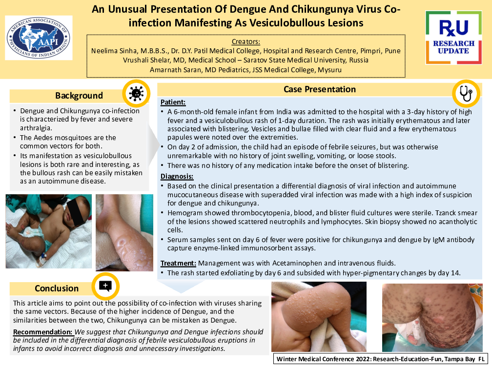 This article aims to point out the possibility of co-infection with viruses sharing the same vectors. Because of the higher incidence of Dengue, and the similarities between the two, Chikungunya can be mistaken as Dengue. We suggest that Chikungunya and Dengue infections should be included in the differential diagnosis of febrile vesiculobullous eruptions in infants to avoid incorrect diagnosis and unnecessary investigations.