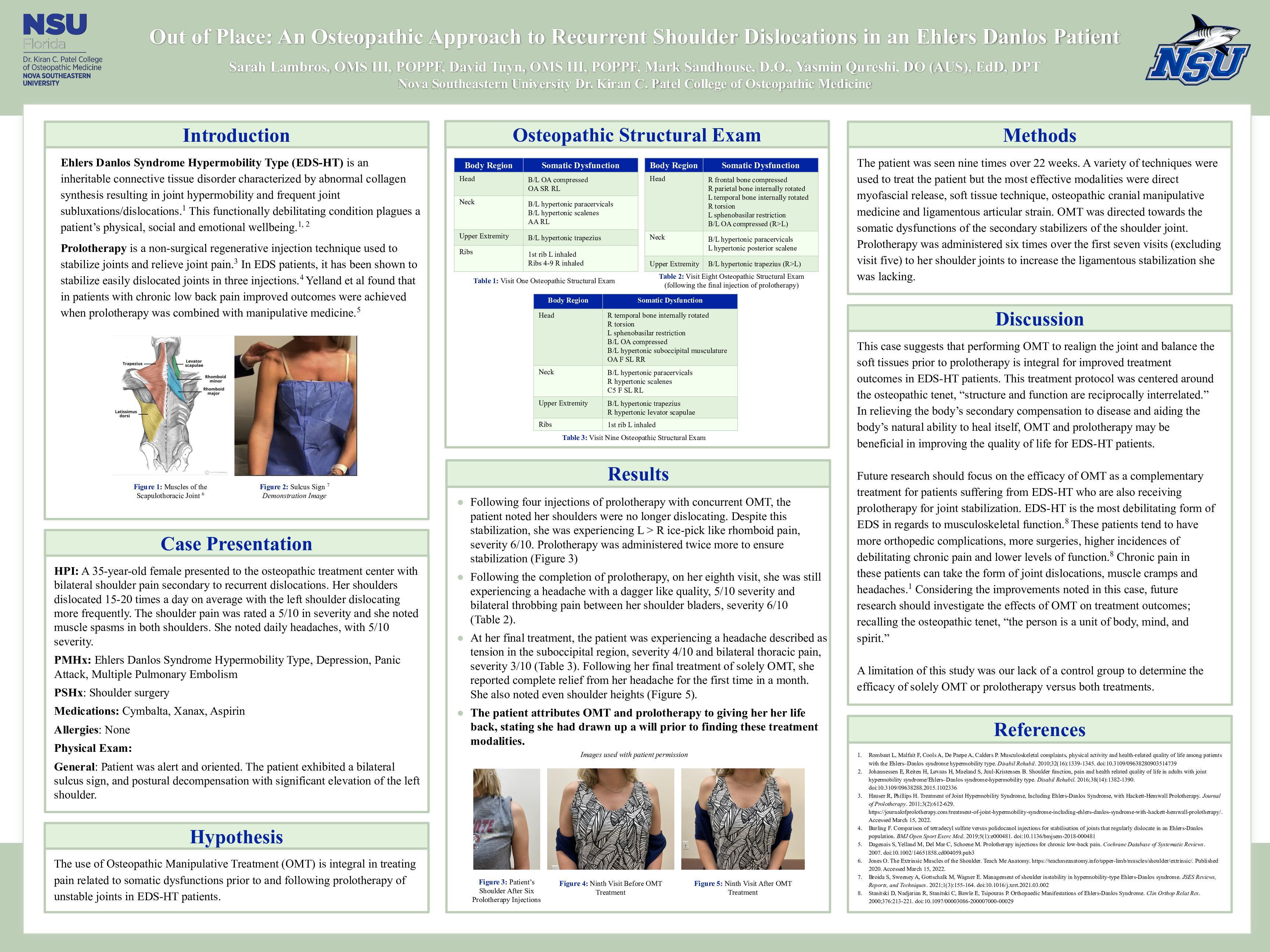 Discussion: This case suggests that performing OMT to realign the joint and balance the soft tissues prior to prolotherapy is integral for improved treatment outcomes in EDS-HT patients. In relieving the body’s secondary compensation to disease and aiding the body’s natural ability to heal itself, OMT and prolotherapy may be beneficial in improving the quality of life in EDS-HT patients. A limitation of this study was our lack of a control group to determine the efficacy of OMT versus prolotherapy versus both treatments.