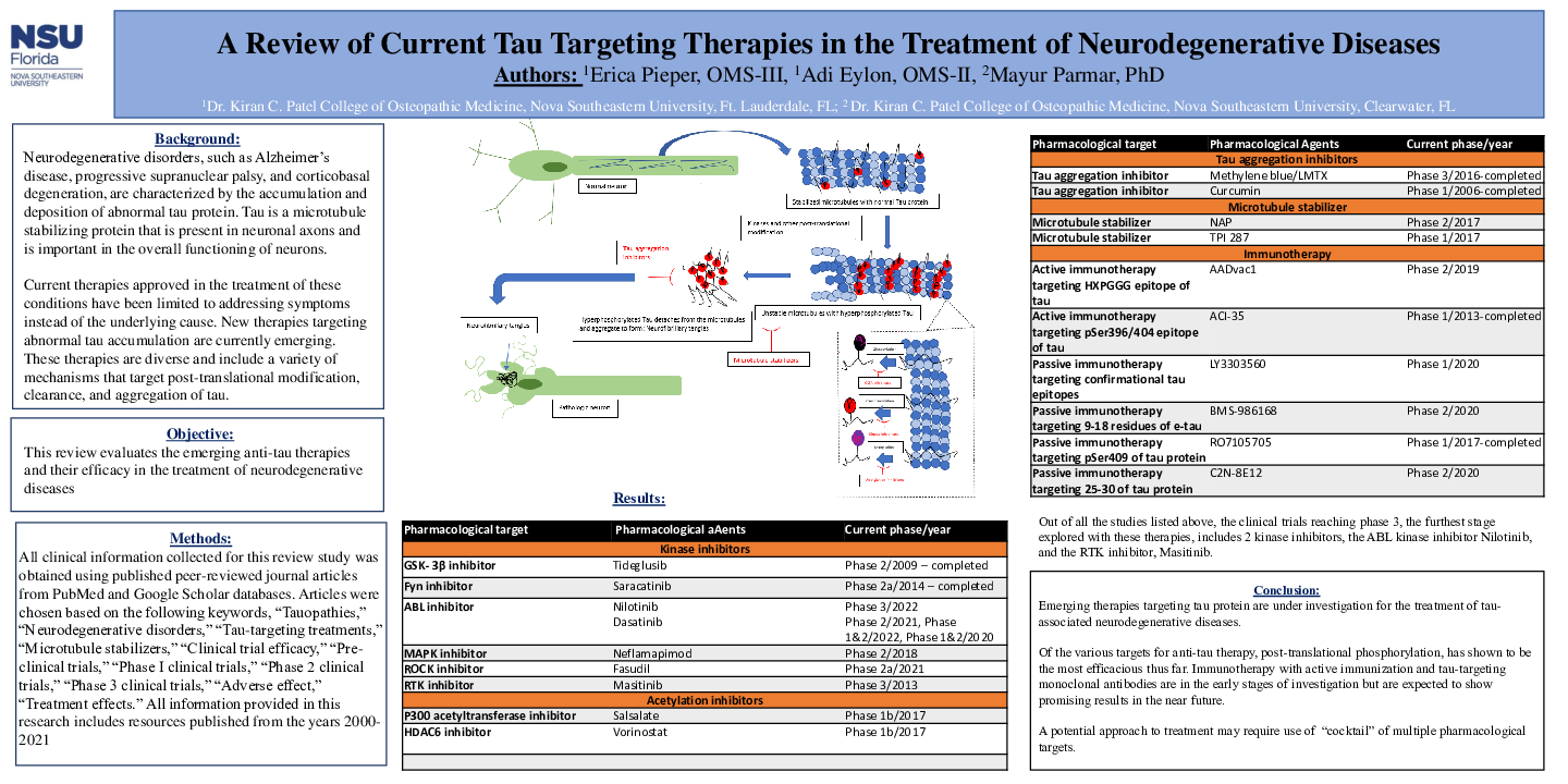 Methods: This study was designed to examine potential anti-tau therapies that are currently undergoing preclinical and clinical trials. The current targets that will be investigated in this study includes 1) post-translational modification involving phosphorylation, acetylation, and glycosylation of tau, 2) tau aggregation inhibitors, and 3) microtubule stabilizers. The treatments under investigation in this study are delivered mainly via 1) immunotherapy, and 2) gene therapy. Efficacy, side effects, and challenges encountered for each drug target will be reviewed.