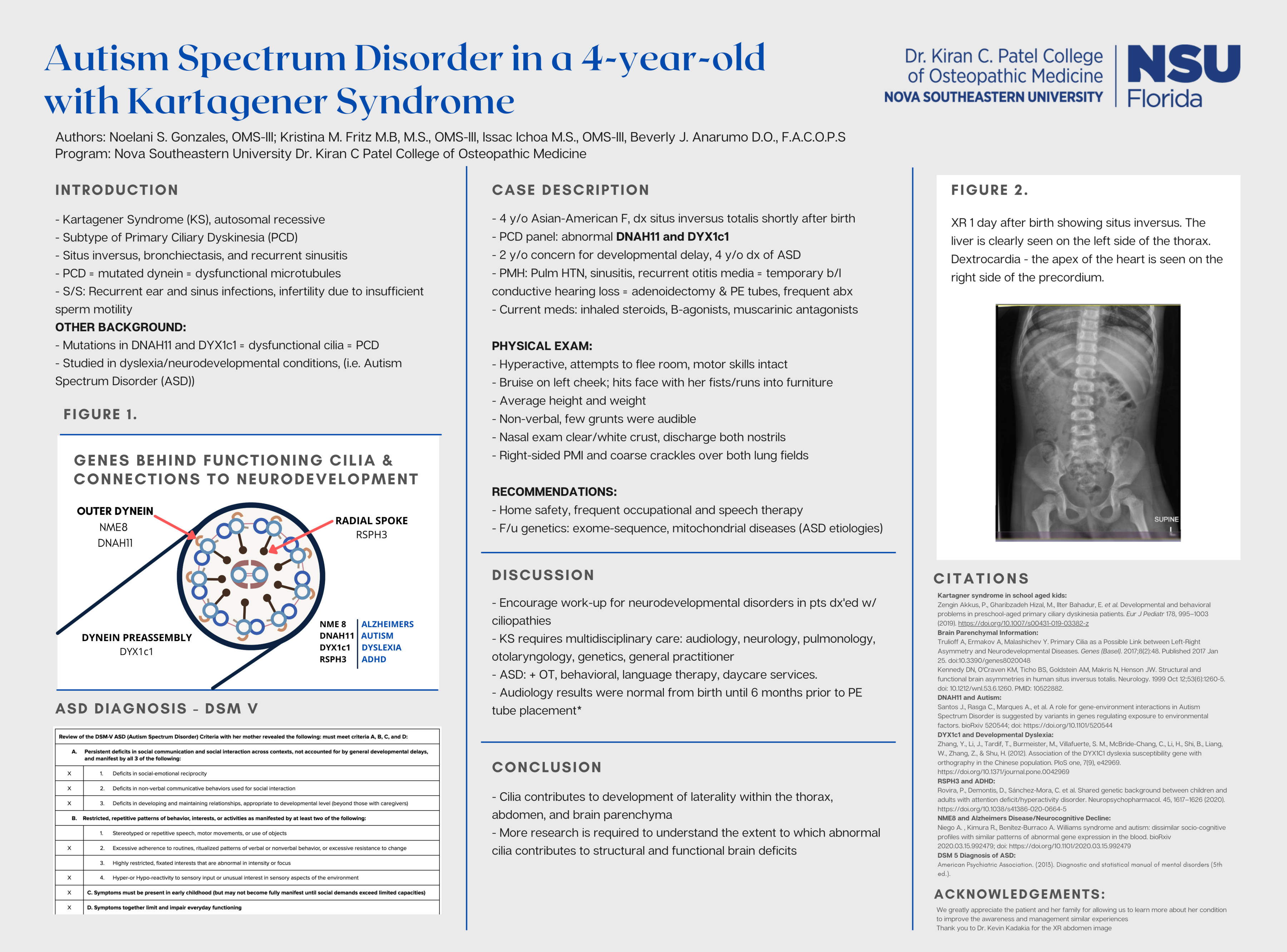 Introduction: Kartagener Syndrome (KS) is an autosomal recessive disorder classified as a subtype of Primary Ciliary Dyskinesia (PCD) that involves situs inversus, bronchiectasis, and recurrent sinusitis. The predominant defect that characterizes PCD is mutated dynein, leading to dysfunctional microtubules [1]. Clinical features include, but are not limited to, recurrent ear and sinus infections and infertility due to insufficient sperm motility. Mutations in genes such as dynein axonemal heavy chain 11 (DNAH11) and dyslexia susceptibility 1 candidate 1 gene (DYX1c1) have been associated with dysfunctional cilia and contribute to PCD. These genes have also been studied for their role in dyslexia and other neurodevelopmental conditions, (i.e. Autism Spectrum Disorder (ASD)) [2]. In one specific study, there was a higher prevalence of neurodevelopmental issues (i.e. communication delays) in elementary school children with PCD when compared to age-matched controls and subjects with cystic fibrosis [3]. Other studies have reported left-right axis abnormalities in the brain associated with ciliopathies, indicating possible association with neurodevelopmental disorders [4].