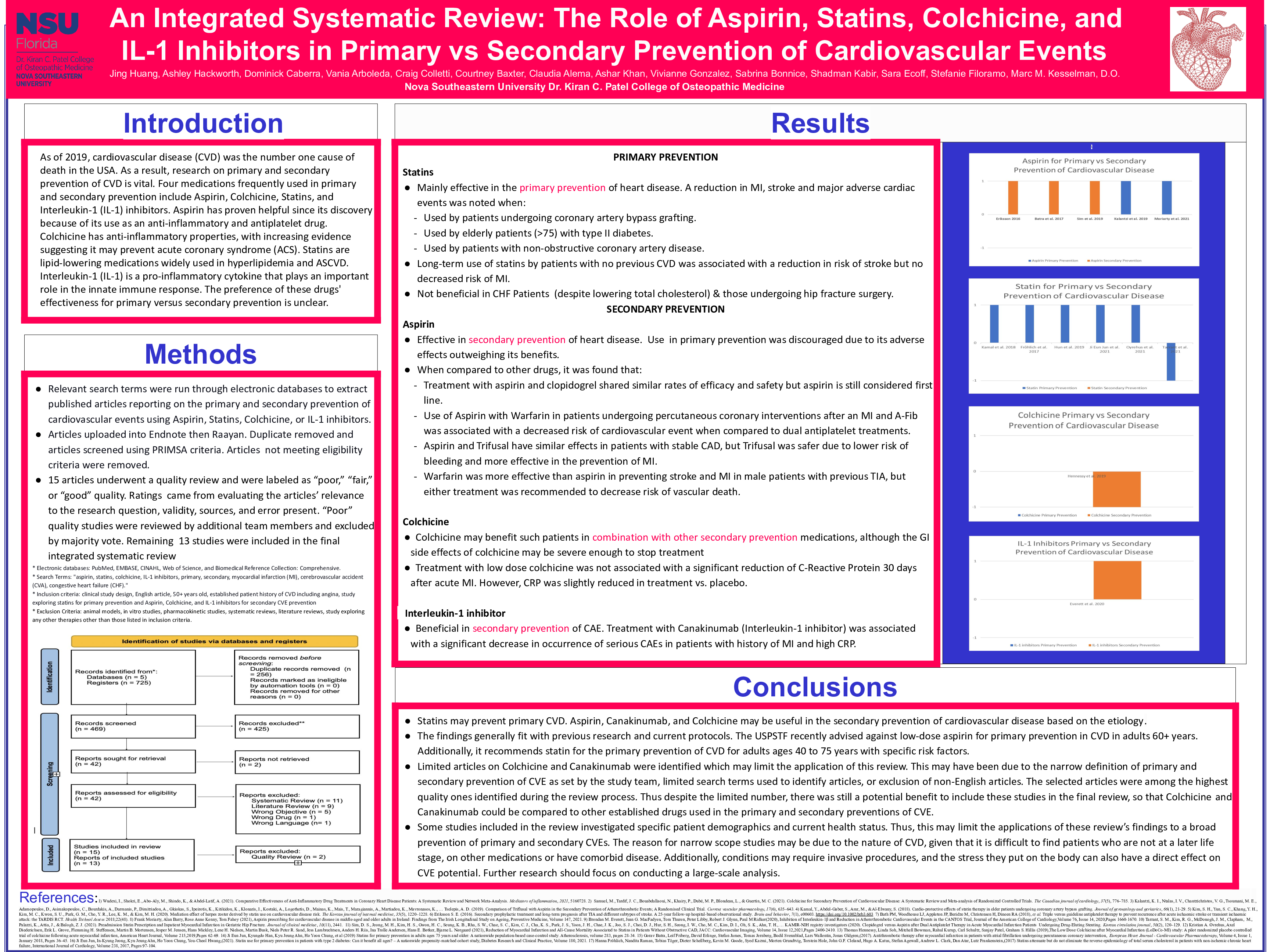 Methods: PubMed, EMBASE, CINAHL, Web of Science, and Biomedical Reference Collection: Comprehensive, were searched on November 12-14th, 2021, to extract published articles using the selected drugs as primary or secondary prevention of CVE. The search terms were "aspirin, statins, colchicine, IL-1 inhibitors, primary, secondary, myocardial infarction (MI), cerebrovascular accident (CVA), congestive heart failure (CHF)." The resulting articles were screened in accordance with PRISMA guidelines.