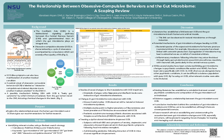The goal of our scoping review aims to analyze and expose the current understanding of a possible relationship between the gut-brain-axis (GBA) and obsessive compulsive behaviors (OCB), highlight any discrepancies in research or gaps in our current knowledge, and give our recommendations for further research. A Boolean search strategy was used in the following 3 databases: PubMed, Embase, and Webofscience. Three specific search terms were combined: “gut microbiome” OR “gut microbiota” OR “gut brain axis” AND “obsessive compulsive disorder” OR “OCD”. Initial searches yielded 61 results. After screening for appropriateness, relevance, and validity, 12 articles were agreed upon, including results from animal studies (n=7) and 8 human studies (n=8). Studies showed changes to the metabolome with obsessive compulsive disorder (OCD) treatment, gut microbiome compositions and diversity. Inactivation of certain microbiome compositions was linked with the induction of OCD and addition of protective microbiome compositions was linked with the decrease of OCD. A proposed mechanism connecting the gut and the brain is “leaky-gut-syndrome” where immune mediators from the lumen of the gut into the blood vessels beneath can travel to the central nervous system and induce changes to the brain. Current studies have shown that including the evaluation of the gut microbiome is important for the treatment and management of patients with obsessive-compulsive behaviors as part of their clinical picture. Future research needs to focus on human subjects with a diagnosis of OCD, incorporating a homogenous control group for robust comparison of gut microbiota. Specifically, studies should be aimed at establishing a causal relationship between OCB/OCD and GBA by identifying the specific bacteria prevalent in disordered human gut microbiota.