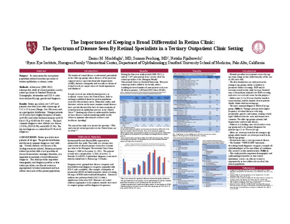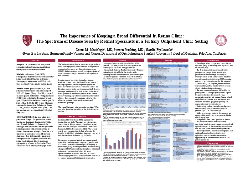 Methods: A four-year (2008-2011) retrospective study of all new patients seen by retina specialists at Stanford University. Demographic information and ICD-9 codes were analyzed by age, gender and diagnosis.