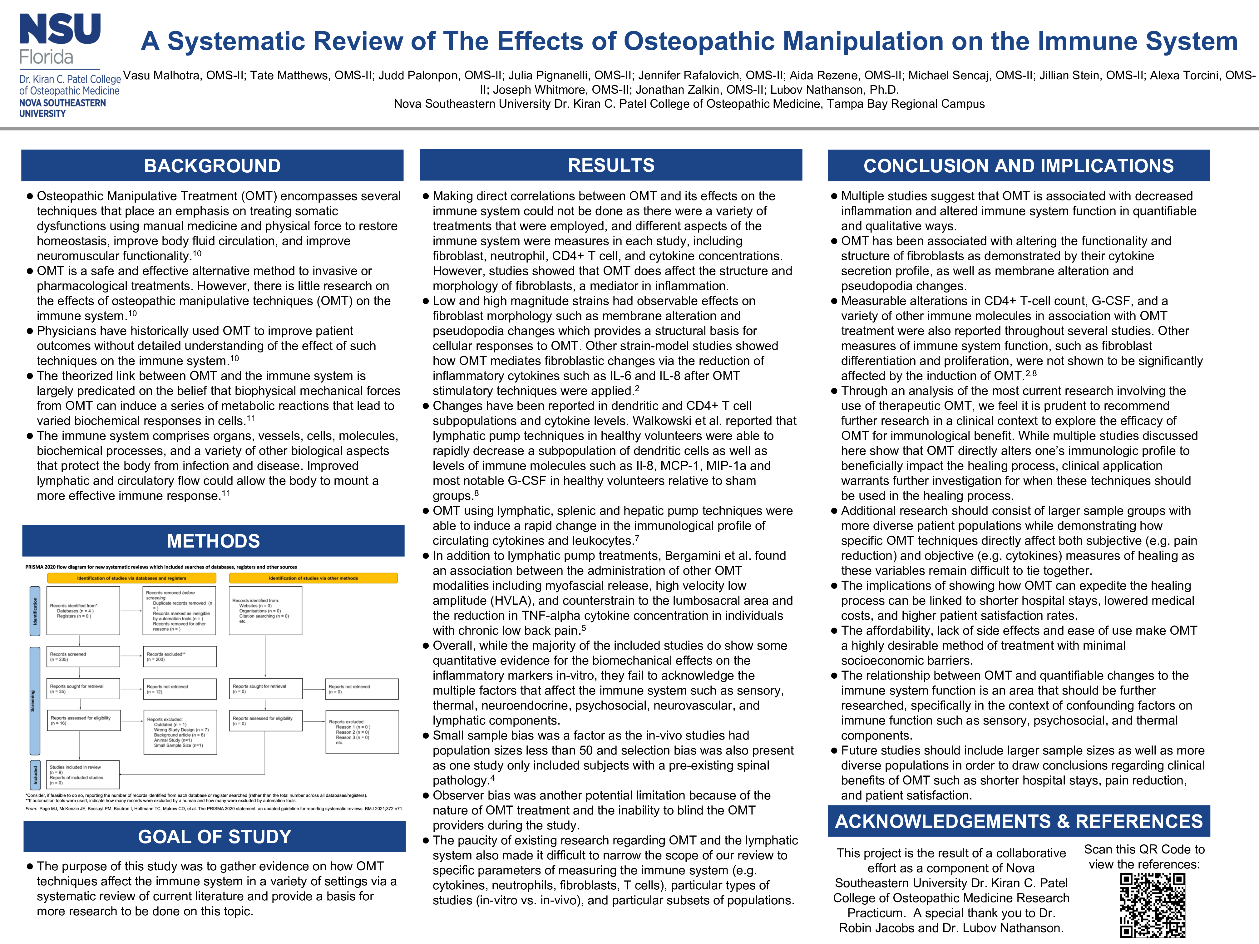 Osteopathic Manipulative Medicine (OMM) is a holistic approach to medicine that traditionally aims to treat a wide range of health conditions by facilitating the body’s ability to heal itself. It is a safe and effective alternative method to invasive or pharmacological treatments. However, there is little research on the effects of osteopathic manipulative techniques (OMT) on the immune system. More specifically, the degree to which OMT therapy benefits patients with a compromised immune system remains unclear. The purpose of this study was to gather evidence of how OMT strategies affect the immune system in a variety of settings via systematic review of current literature, and provide a basis for more research to be done on the topic. A computerized search of Embase, Google Scholar, Pubmed, and Medline was used in a systematic fashion to find articles that explored the relationship between OMT and the immune system. Using the Boolean/phrase (”Inflammation” OR “Immune system” OR “lymphatic” OR “Immune”); AND (“Osteopathic manipulation” OR “osteopathic manual” OR “osteopath”) 235 articles were screened. We extracted data from only those studies that contained quantitative results that met our inclusion criteria of 1) any Patient treated with OMT, 2) subjects with compromised immune system or pain, and 3) studies that included cytokines, inflammation markers, or immune molecules as their qualitative measures. 9 studies were retained for the final review. Multiple studies suggest that OMT is associated with decreased inflammation and altered immune system function in quantifiable and qualitative ways. OMT has been associated with altering the functionality and structure of fibroblasts as demonstrated by their cytokine secretion profile, as well as membrane alteration and pseudopodia changes. Measurable alterations in CD4+ T-cell count, G-CSF, and a variety of other immune molecules in association with OMT treatment were also reported throughout several studies. Other measures of immune system function, such as fibroblast differentiation and proliferation, were not shown to be significantly affected by the induction of OMT. The relationship between OMT and quantifiable changes to the immune system function is an area that should be further researched, specifically in the context of confounding factors on immune function such as sensory, psychosocial, and thermal components. Future studies should include larger sample sizes as well as more diverse populations in order to draw conclusions regarding clinical benefits of OMT such as shorter hospital stays, pain reduction, and patient satisfaction.