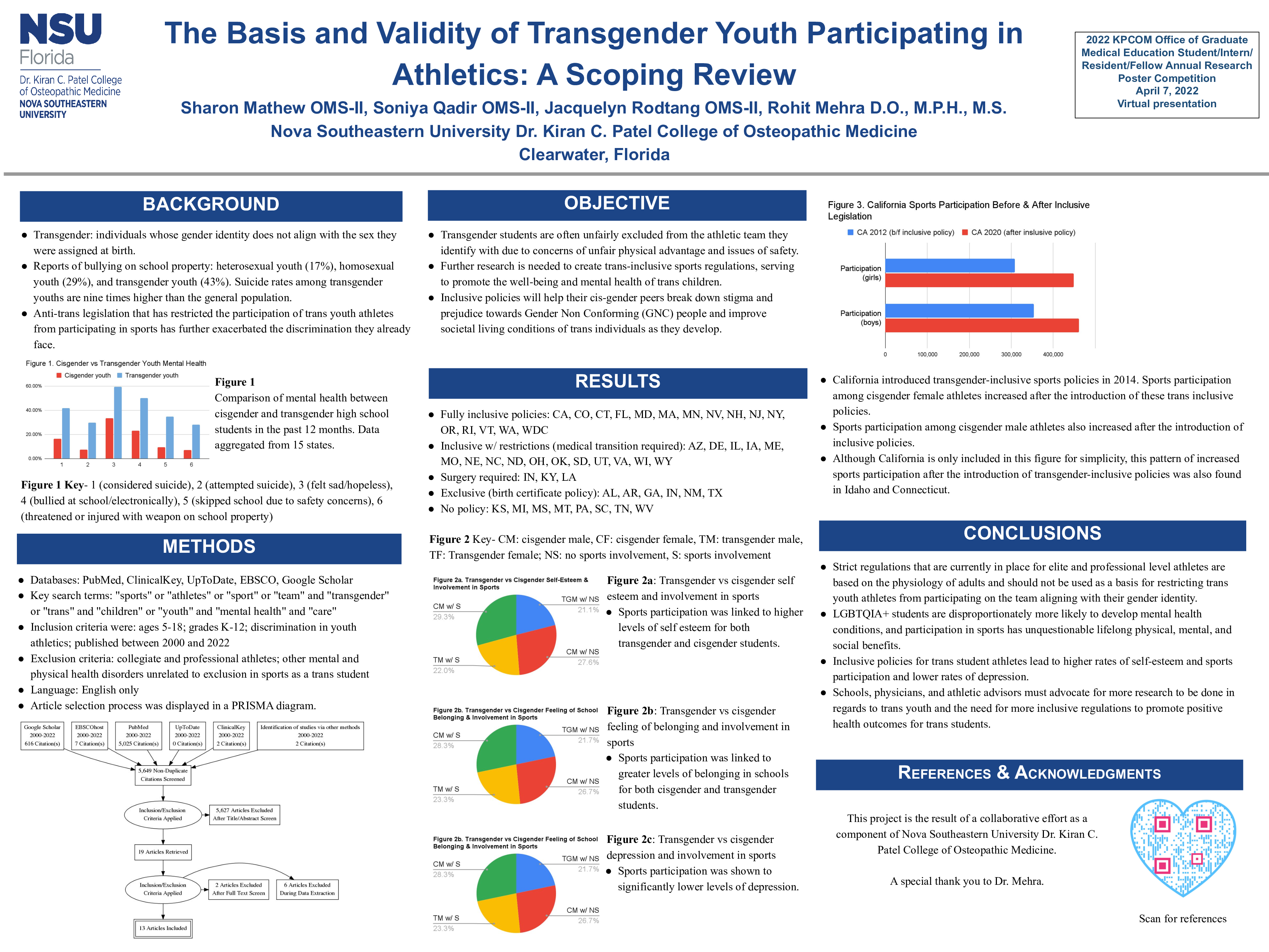 Conclusions: Strict regulations that are currently in place for elite and professional level athletes are based on the physiology of adults and should not be used as a basis for restricting trans youth athletes from participating on the team aligning with their gender identity. LGBTQIA+ students are disproportionately more likely to develop mental health conditions, and participation in sports has unquestionable lifelong physical, mental, and social benefits. Considering this, schools, physicians, and athletic advisors must advocate for more research to be done in regards to trans youth and the need for more inclusive regulations to promote positive health outcomes for trans students.