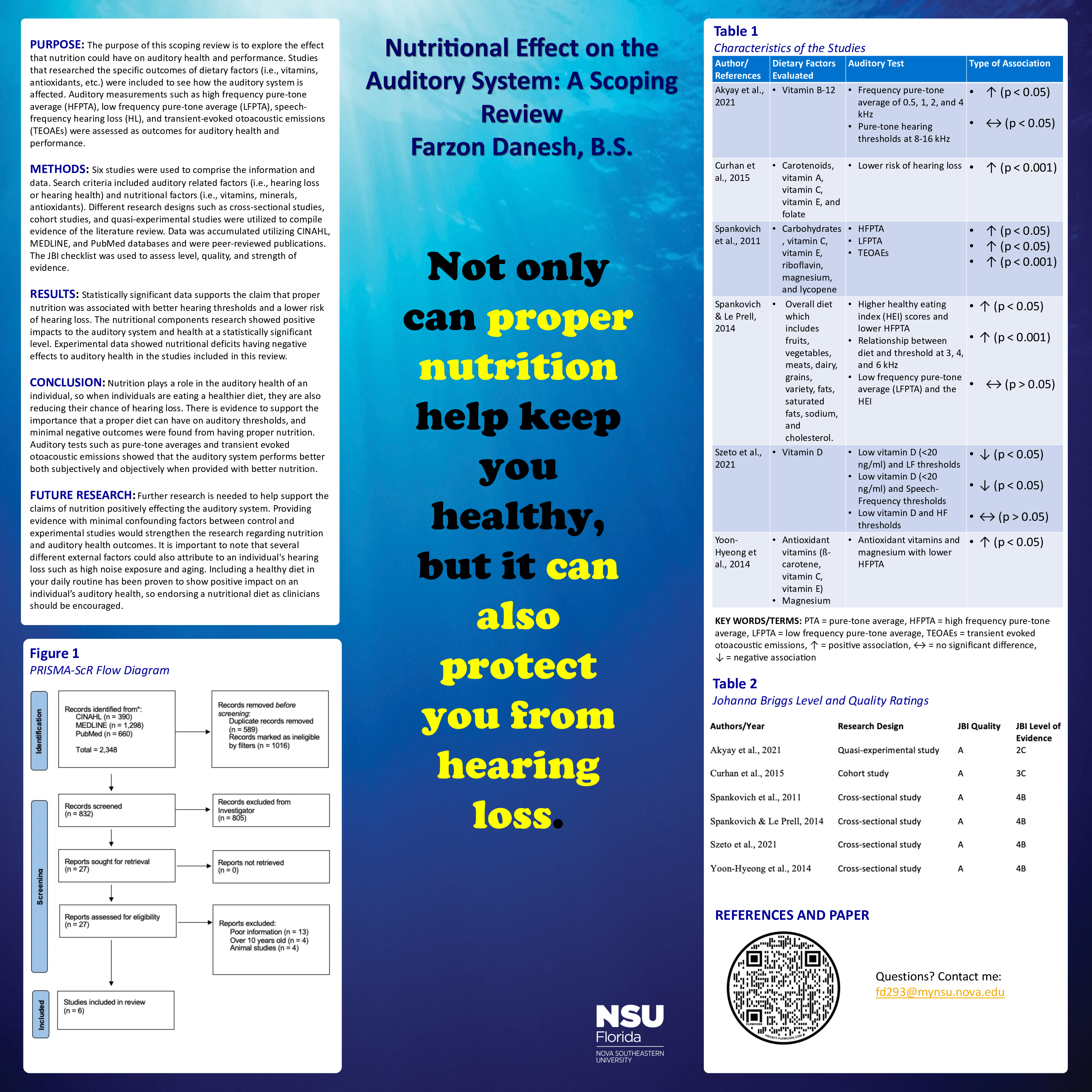 Methods: Six studies were used to comprise the information and data. Search criteria included auditory related factors (i.e., hearing loss or hearing health) and nutritional factors (i.e., vitamins, minerals, antioxidants). Different research designs such as cross-sectional studies, cohort studies, and quasi-experimental studies were utilized to compile evidence of the literature review. Data was accumulated utilizing CINAHL, MEDLINE, and PubMed databases and were peer-reviewed publications. The JBI checklist was used to assess level, quality, and strength of evidence.