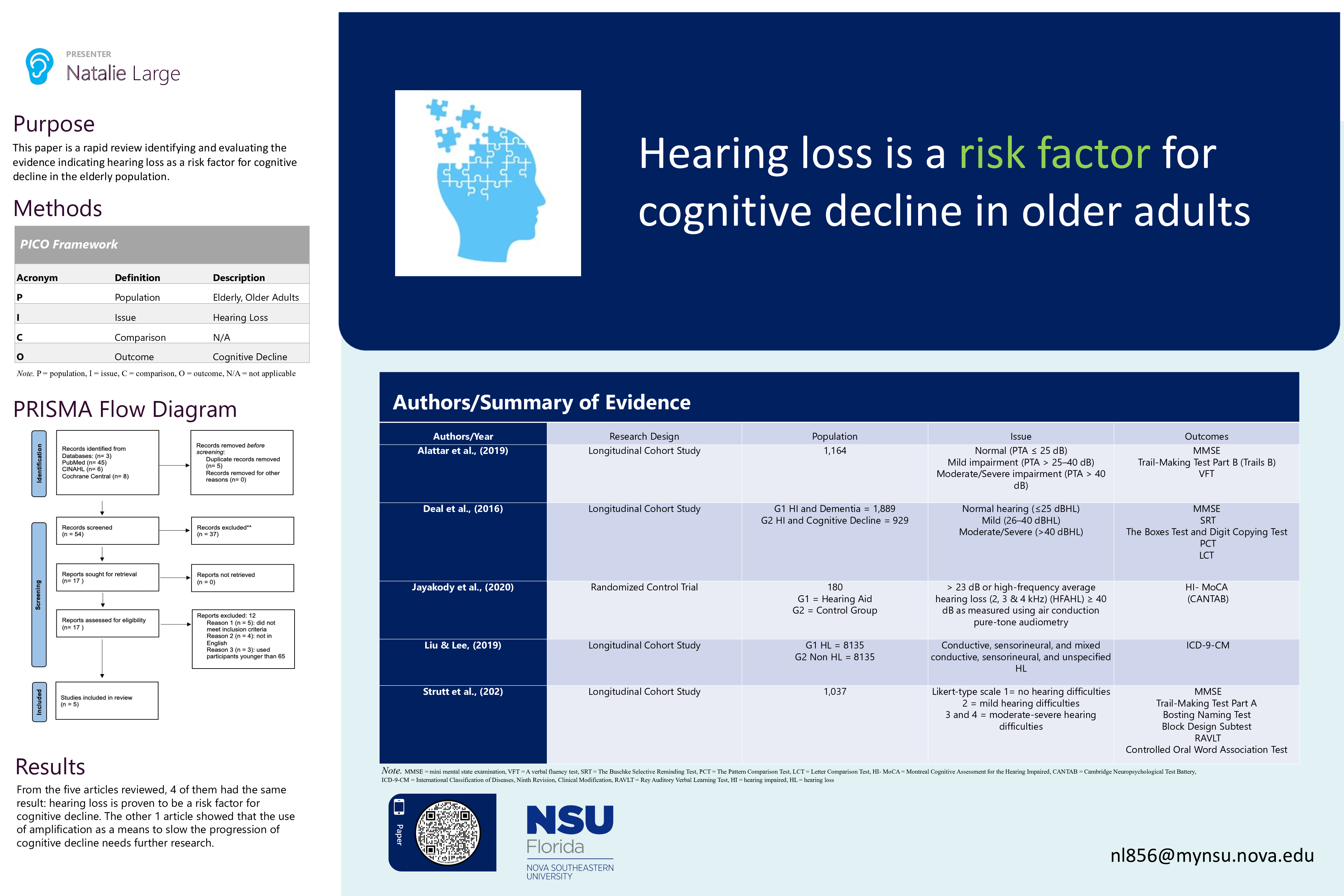 Methods: A literature database search analysis was performed using PUBMED, Cochrane Central, and CINAHL. Search criteria included older adults aged 65 and up with diagnosed or self-reported hearing loss and no previous diagnosis of dementia or Alzheimer’s disease. Participants were excluded if they had been diagnosed with dementia or tested for it before the study began. Hearing loss was assessed using Pure Tone Average (PTA) categorized as follows: normal (</= 20 dB), mild impairment (>/= 25-40 dB), and moderate to severe impairment (> 40 dB). All articles were identified and assessed for eligibility according to PRISMA standards. All data accepted was critically appraised using the JBI critical appraisal checklist and documented on a data extraction form assessing risk of bias, level of evidence, and inclusion/exclusion criteria.