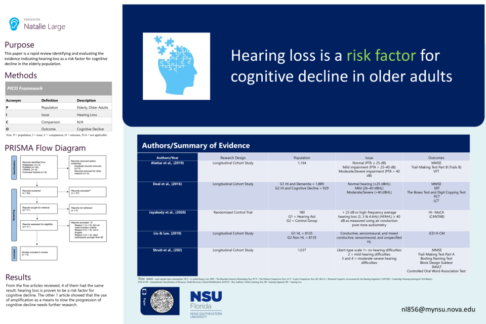 Conclusion: This review was conducted to explore the current literature available on hearing loss as a risk factor for cognitive decline. While there are various hypotheses on whether there is a definitive relationship between the two, many of the studies reviewed found that a hearing loss in older adults will result in a poorer change of cognitive ability or cognitive decline