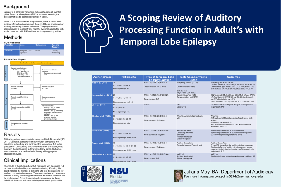 Results: Seven articles were chosen to be presented for the purpose of this scoping review. These included 3 cross-sectional research designs and 4 quasi-experimental prospectively controlled study research design. Each of the studies chosen evaluated the individuals for temporal lobe epilepsy, laterality of disease, duration of disease, and the affects the disease has on the individuals auditory processing abilities.