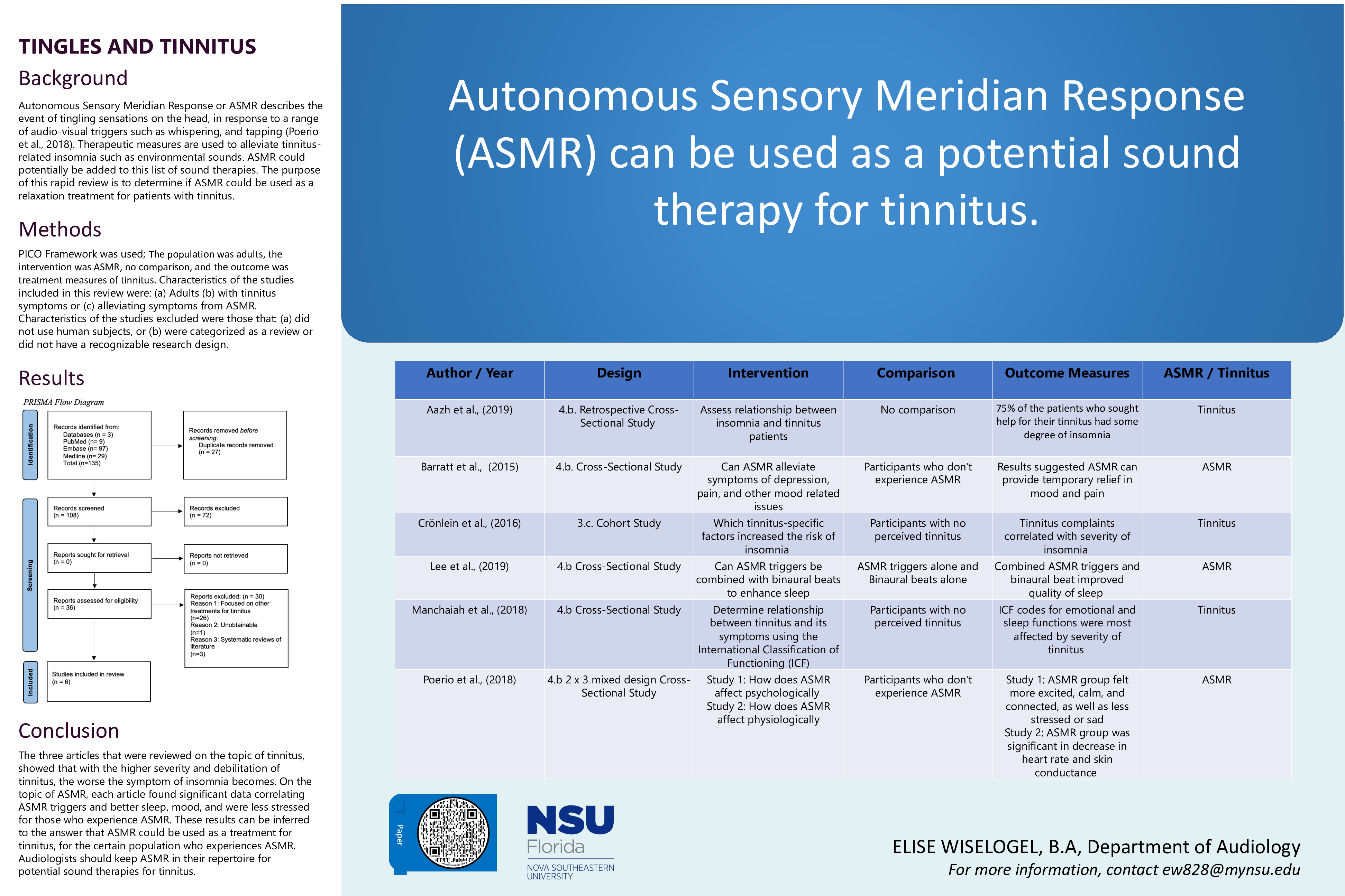 Methods: Using a PICO framework, search terms were generated into three databases; ‘MEDLINE’, ‘Embase’, and ‘Cochrane Central.’ The population was adults, the intervention was ASMR, no comparison, and the outcome was treatment measures of tinnitus. Inclusion criteria for the articles were: published in the last 10 years, noted ASMR with outcomes of relaxation and sleep, or noted tinnitus with the symptoms being stress or insomnia. A PRISMA chart was created to track the selection process.