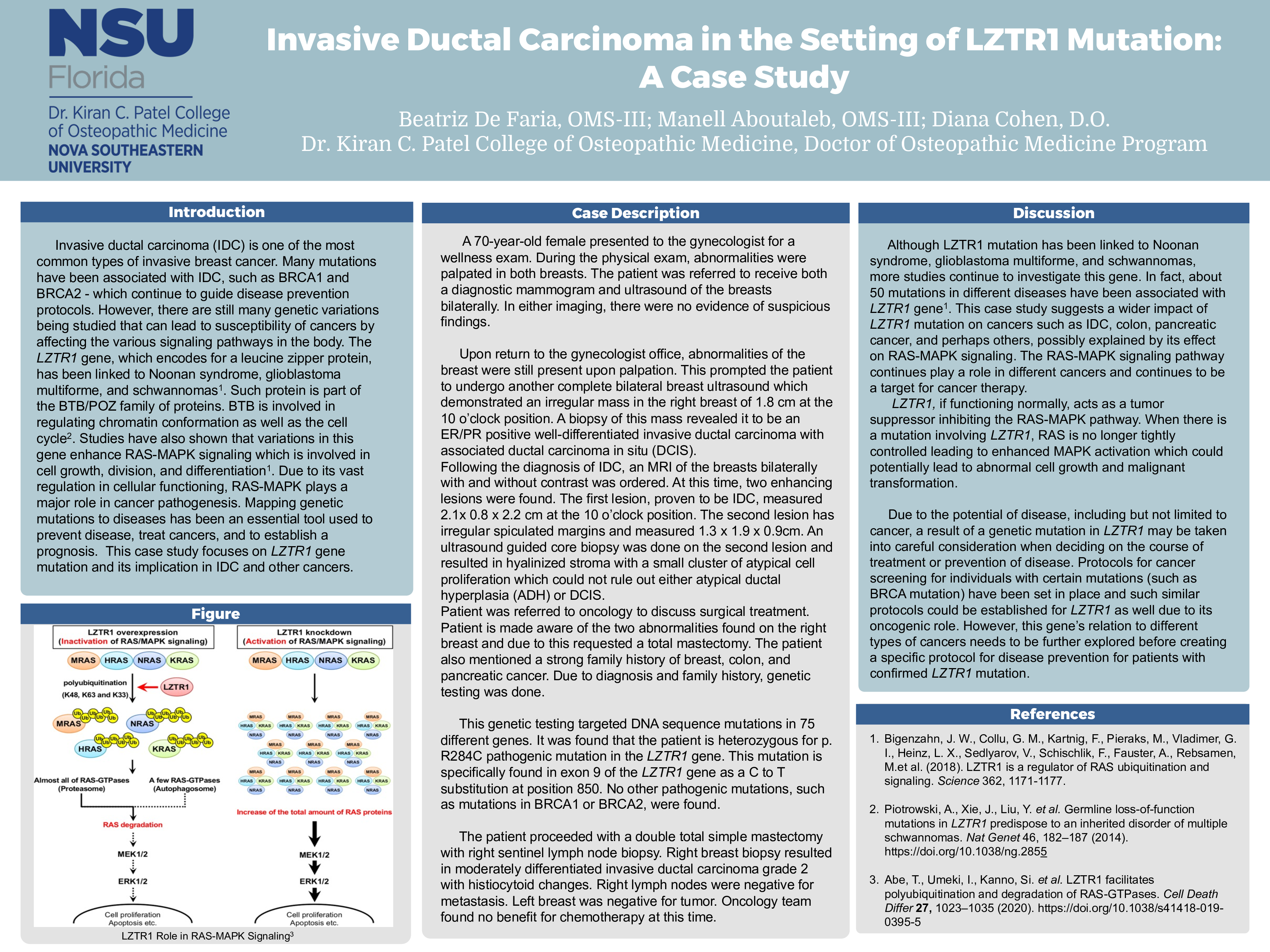 Invasive ductal carcinoma (IDC) is one of the most common types of invasive breast cancer. Many mutations have been associated with IDC which continue to guide disease prevention protocols. Studies have shown that variations in this the LZTR1 gene enhance RAS-MAPK signaling which is involved in cell growth, division, and differentiation1. Mapping such genetic mutations has been an essential tool used to prevent disease, treat cancers, and to establish a prognosis. This case study focuses on LZTR1 gene mutation and its implication in IDC and other cancers.